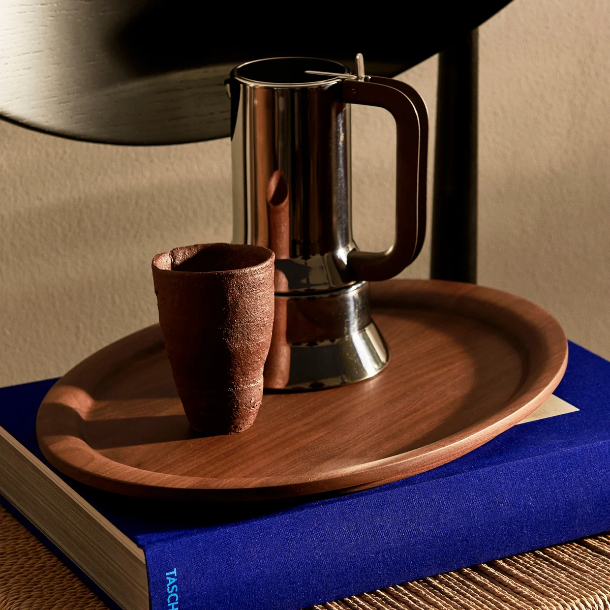 The tray is made of either solid oak or walnut wood and is available in different sizes. The wood is first milled, polished by hand and finally lacquered to protect the surface.