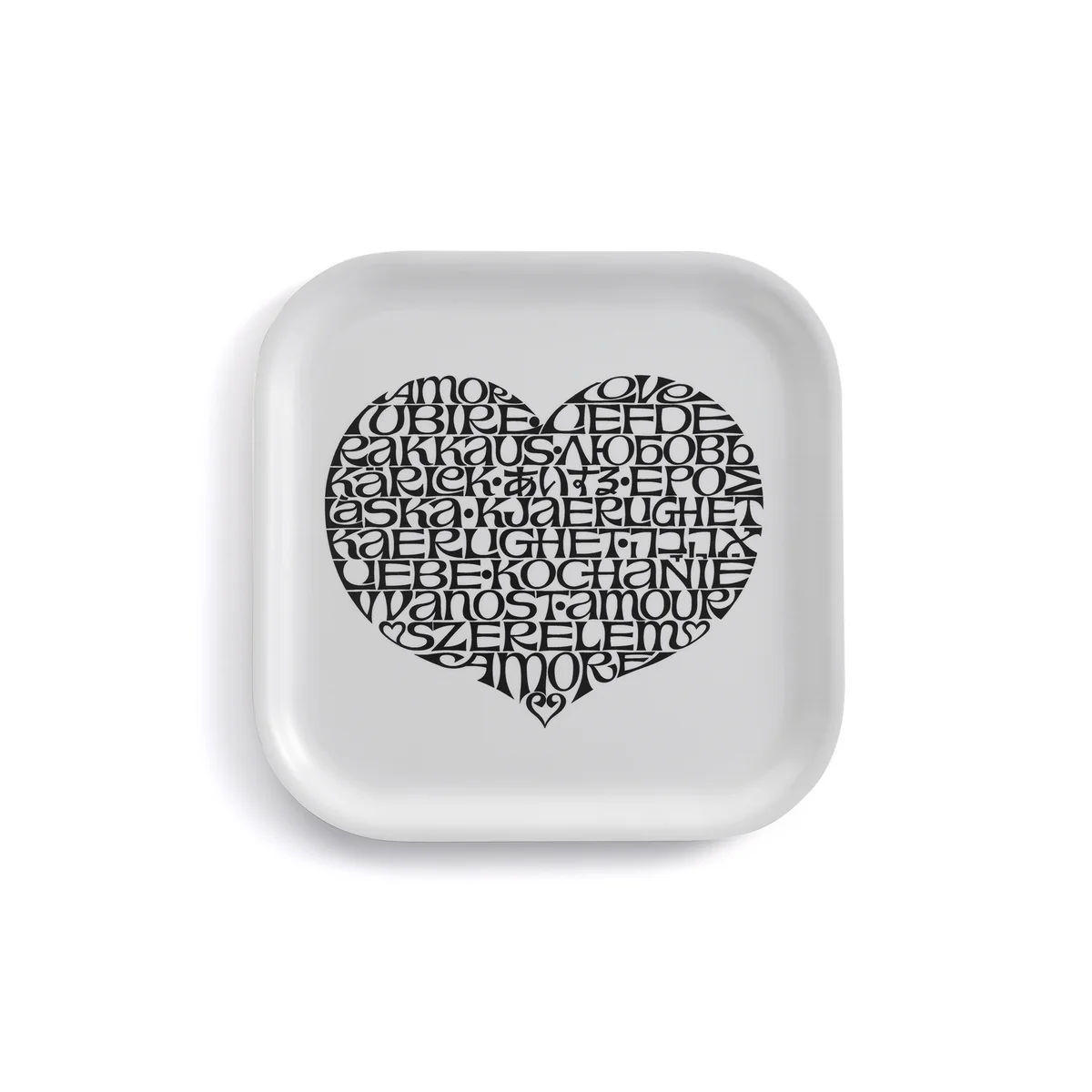 The International Love Heart is a graphic heart of Alexander Girard in black and white. In the heart there is the word love in different languages. The square tray in the dimensions 28 x 28 cm is great in any living area. It can be used for serving coffee and tea or as decoration on the dining table. The tray is made of laminated wood and should therefore only be wiped with a damp cloth.