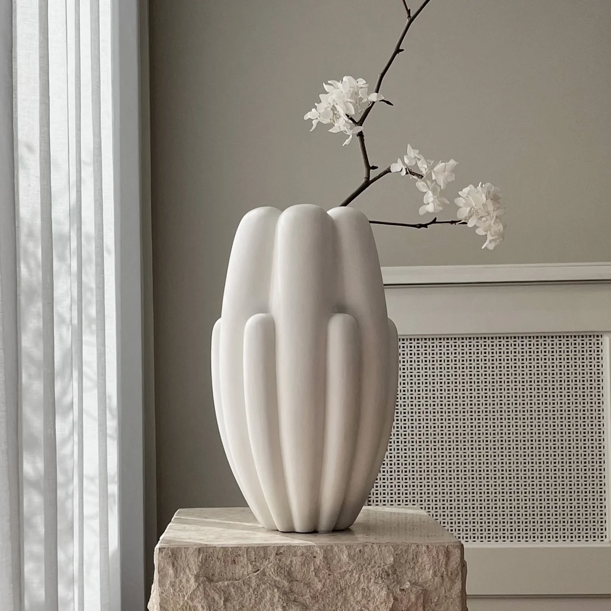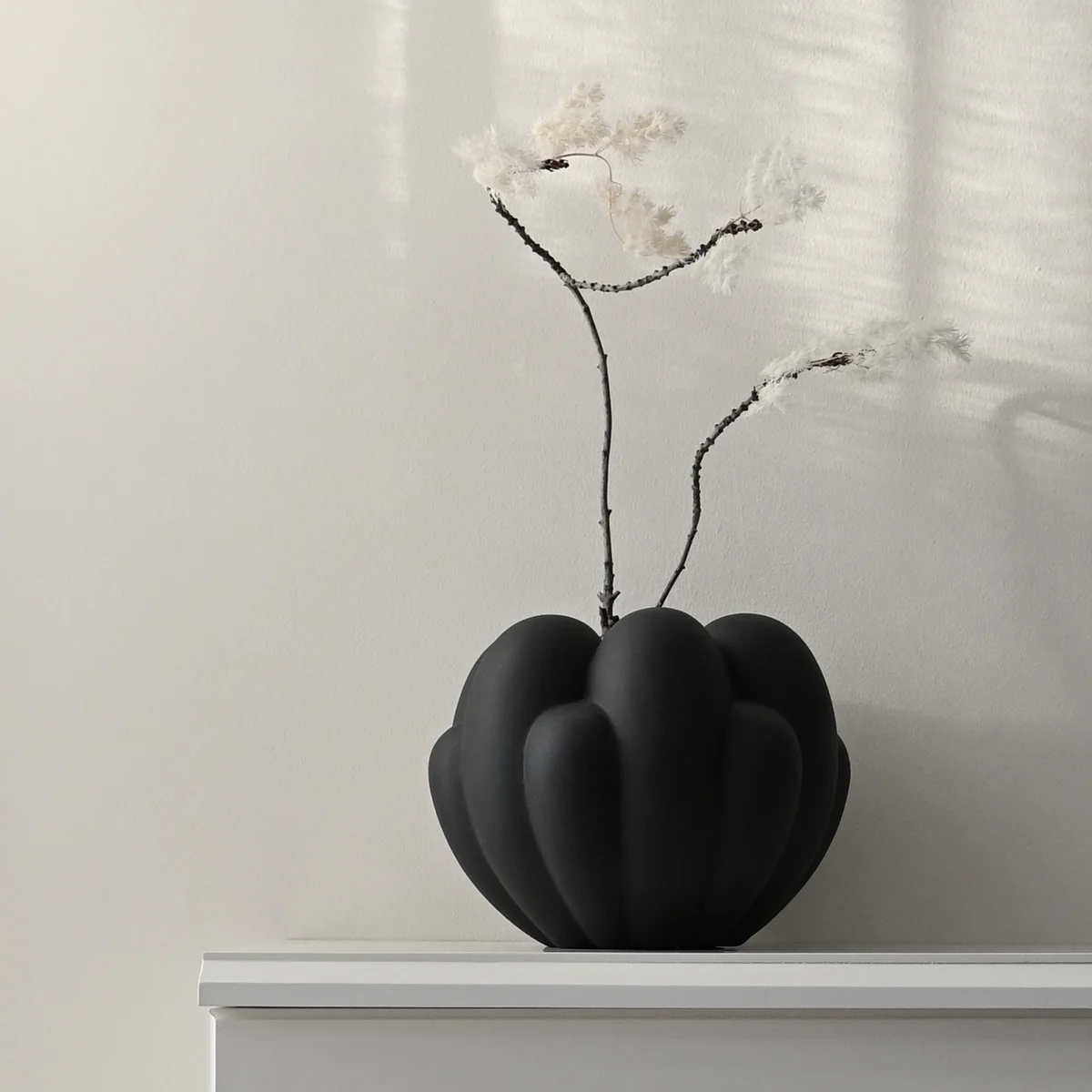 The Bloom vase from the Danish manufacturer 101 Copenhagen impresses with its elegant look of intertwining petals. Bloom The vase is inspired by the floral design of the 70s, but has been given a modern, raw and clear expression. The gently curved surface contrasts with the strong basic geometry of the vase. The beautiful play of shadows lends Bloom depth. Depending on the lighting conditions, the play of shadows changes throughout the day.