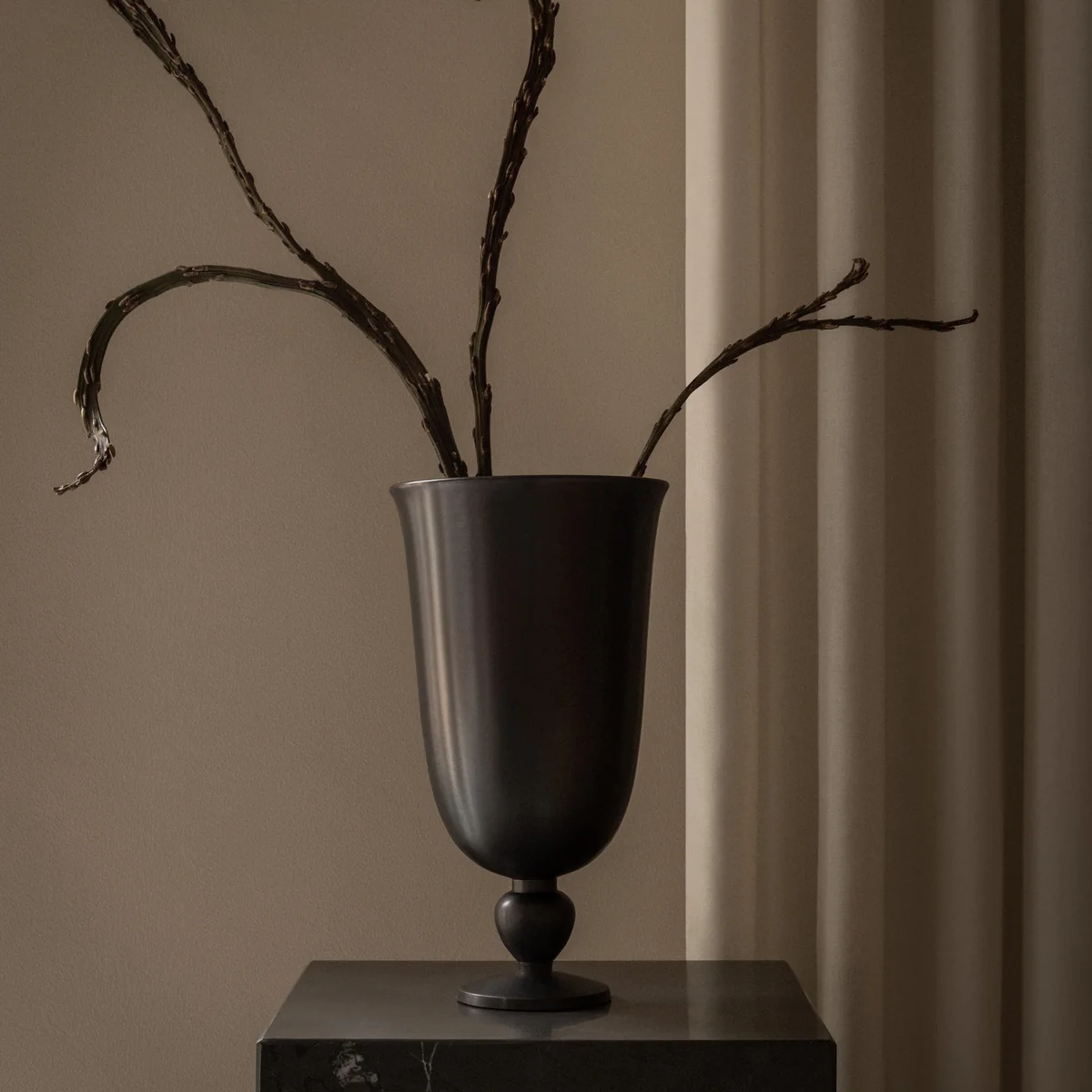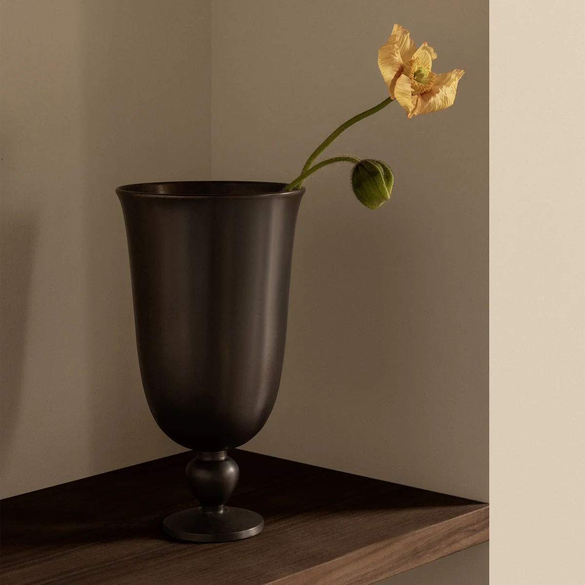 The Pavot vase from Audo combines antique influences with modern design and adds an elegant, historic touch to any room. Made from aluminum and finished with a characteristic bronze-brown patina, the shape of the base is reminiscent of a delicate poppy capsule - a subtle homage to the organic beauty of nature, which gives the vase its French name.