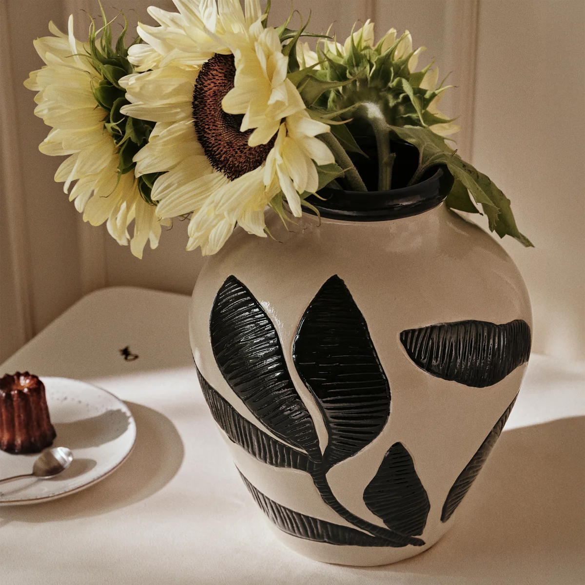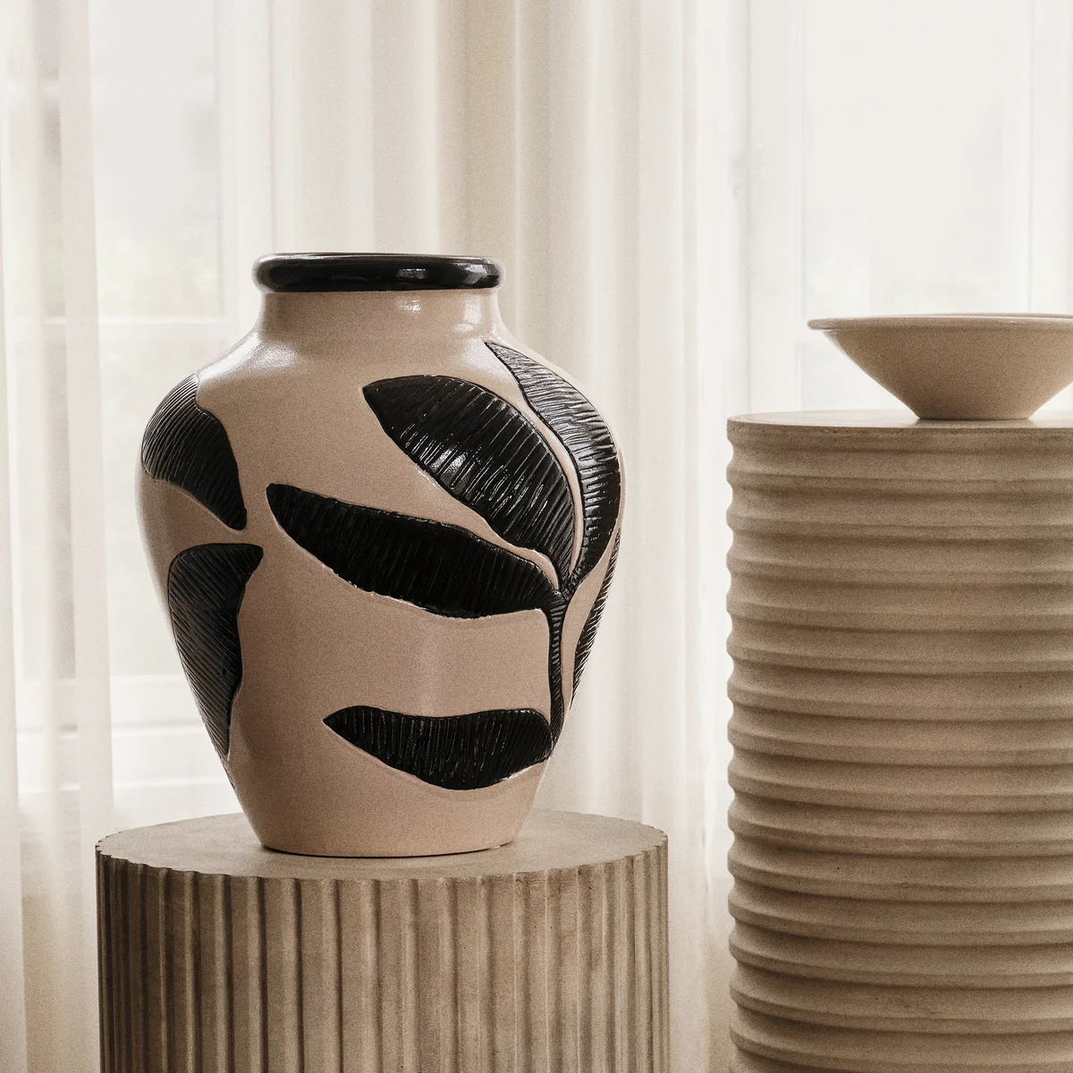 The Herbert vase from Broste Copenhagen combines timeless elegance with natural details. Designed in a beautifully shaped amphora silhouette, the vase made of high-quality ceramic impresses with its subtle leaf pattern, which gives it an organic yet modern look.