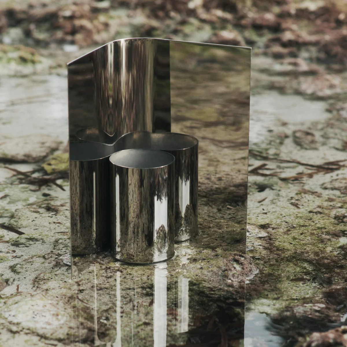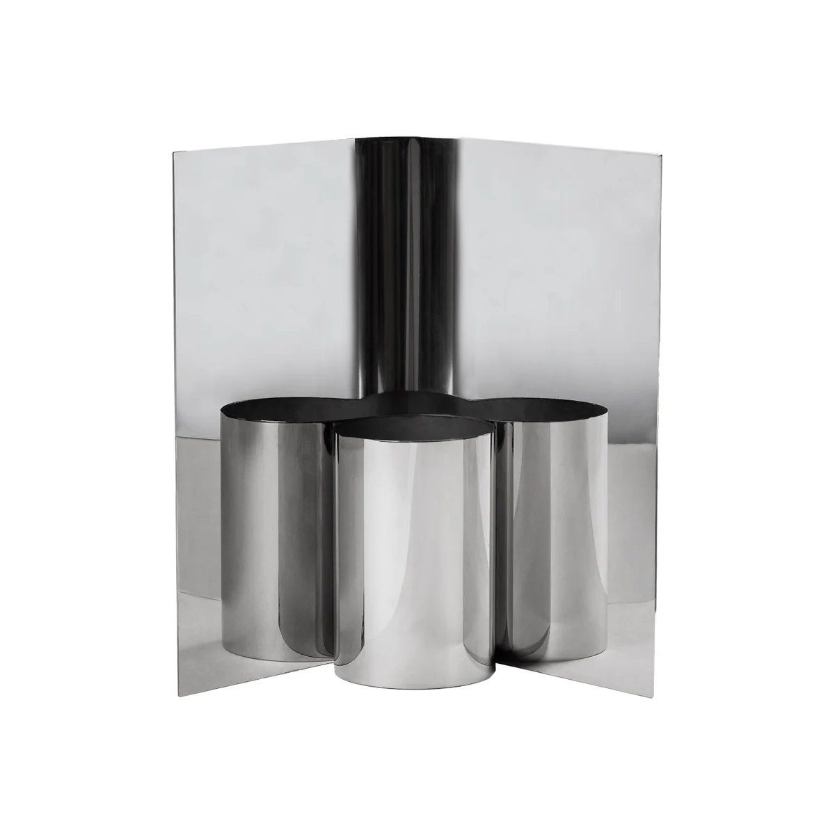The Eddy vase made of highly polished stainless steel fascinates with its reflective surface, which catches the light and reflects its surroundings. Its minimalist design combines a slender cylinder with a concentrically curved stainless steel plate that extends beyond the height of the vase, giving the design a dynamic depth. With its reflective structure, the vase enhances the effect of the bouquet and creates an impressive center of attention in any room.