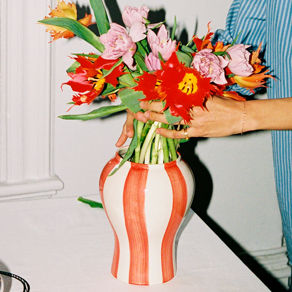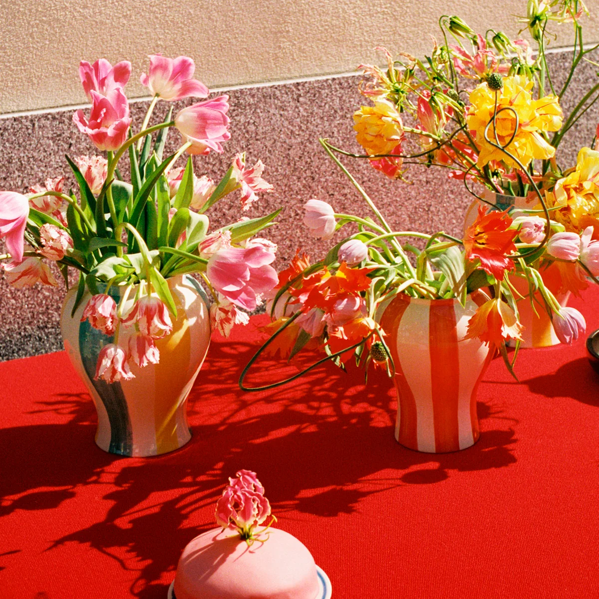 The Sobremesa Vase by artist Laila Gohar in cooperation with the Danish label HAY celebrates being together with friends and family. It is part of the Sobremesa Series, which in a sophisticated way enhances the atmosphere at dinner in an instant and adds a decorative touch to the table setting. The vase is made of stoneware and hand painted with a colorful striped pattern. Since this is a handmade item, each vase is unique. Sobremesa Can be used either for bouquets, flowering branches or even for decorative storage of kitchen utensils.