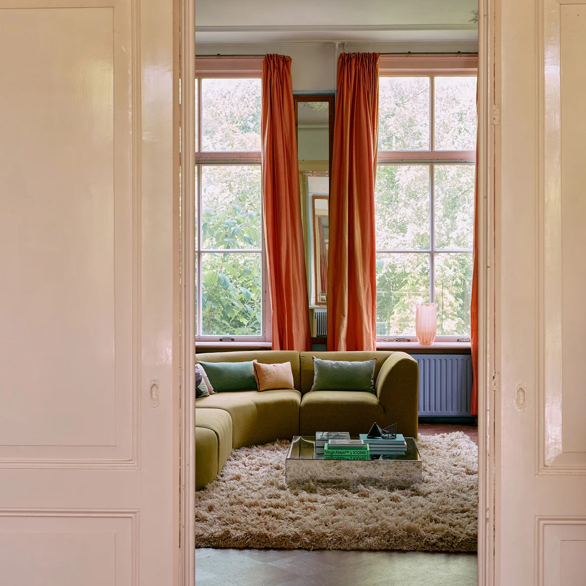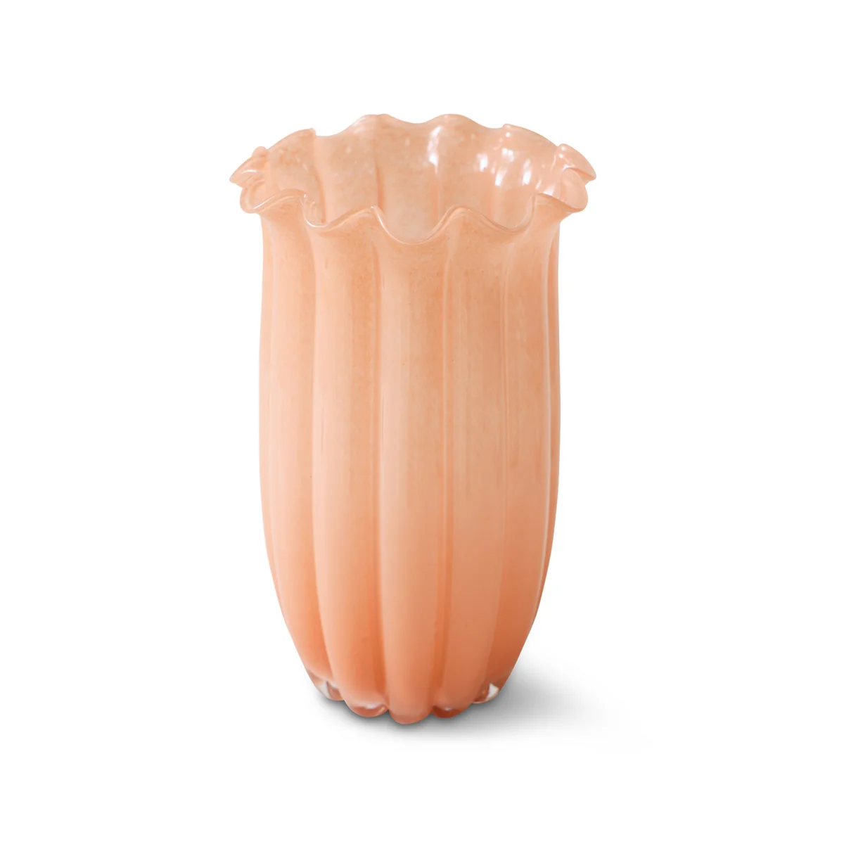 The High glass vase from HKliving combines modern clarity with an artistic design approach, making it an eye-catcher in any living area. The shape of the glass vase is reminiscent of an opening calyx: softly flowing curves and a delicate peach shade that catches the light in a particularly harmonious way. Its generous proportions make it perfect for lavish bouquets of flowers or long-stemmed branches. An expressive design object that is both graceful and grounded.
