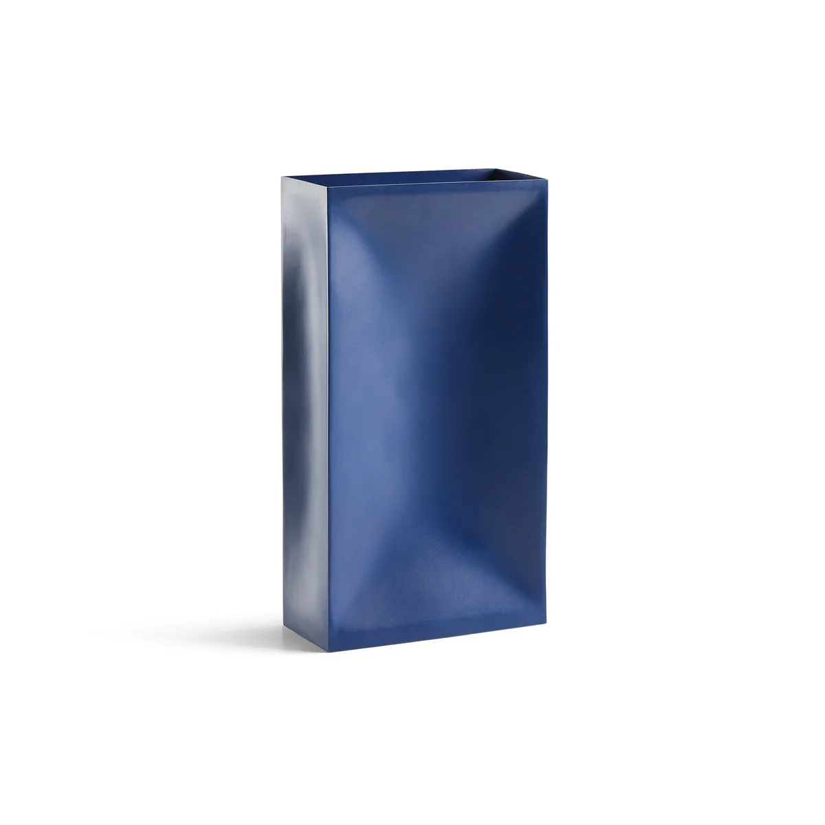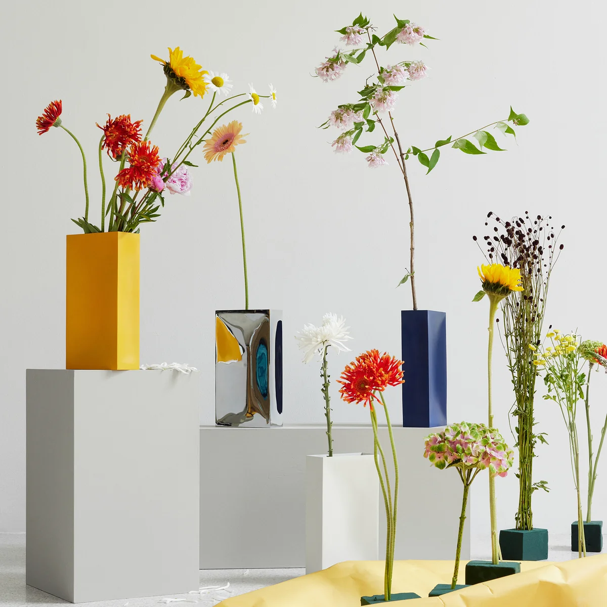 Into is made of pressed steel and is available in four different material finishes and colors. It serves both as a vase to display your favorite flowers and as a tray for fruit, jewelry or letters by simply turning it on its side when it is finished blooming.