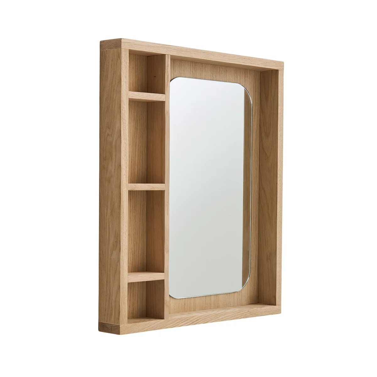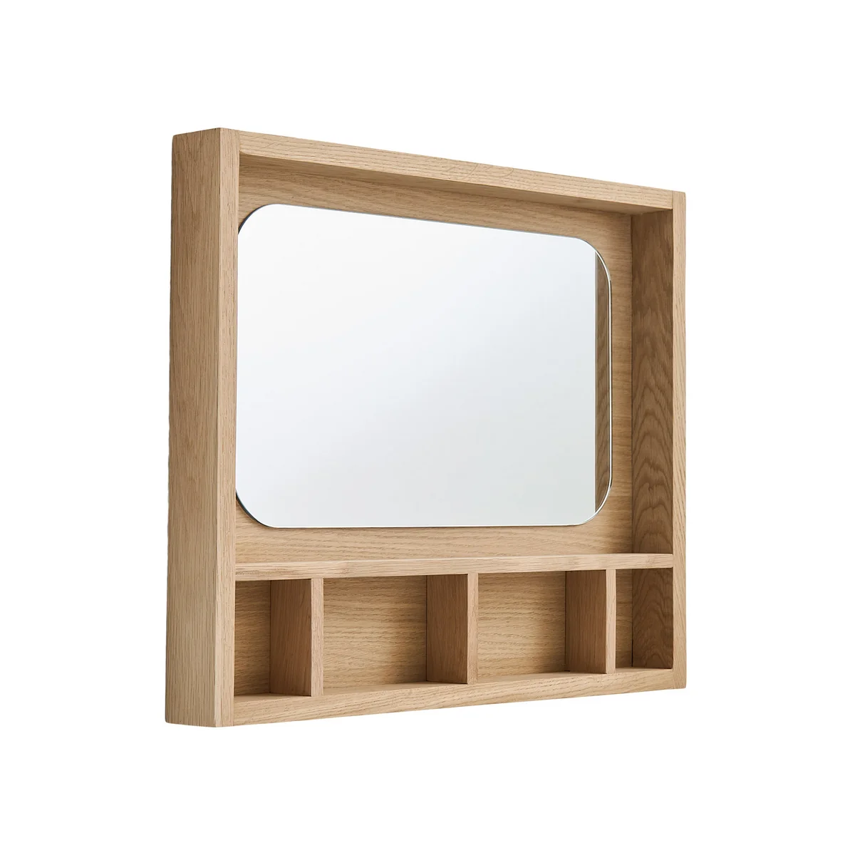 Made from solid oak, Glance exudes natural warmth and quality craftsmanship. The integrated small shelves offer practical storage space for keys, jewelry or care products. Thanks to flexible mounting options, the shelves can be placed next to, above or below the mirror - just as you wish.