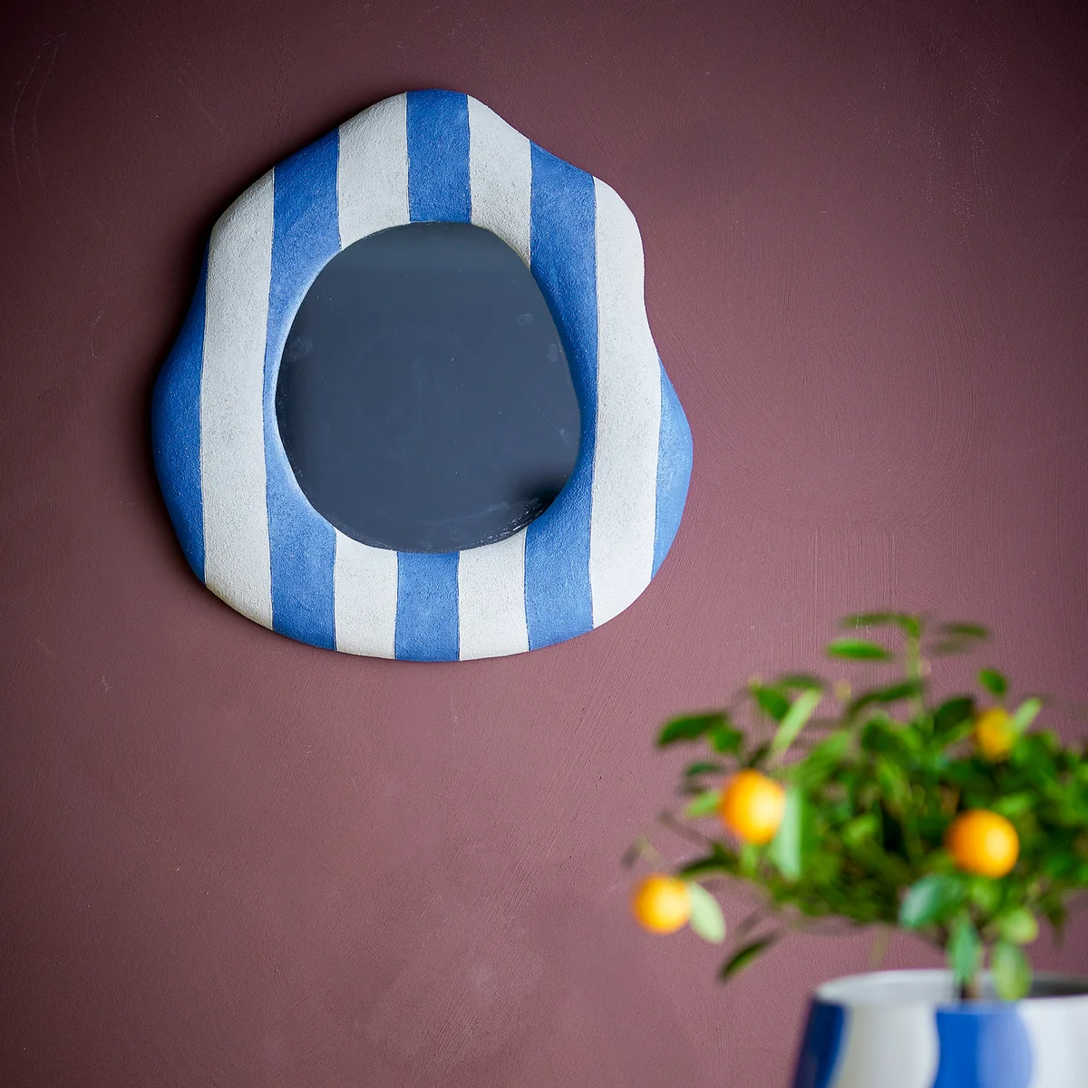 The Travis wall mirror from Bloomingville is an extraordinary design object for modern living spaces. With its striped frame made of blue and light beige polyresin in an organic shape, it brings a breath of fresh air to the wall - whether in the hallway, living room or bedroom.