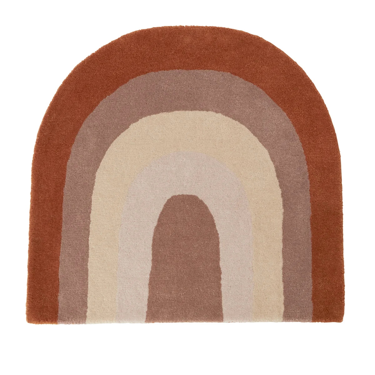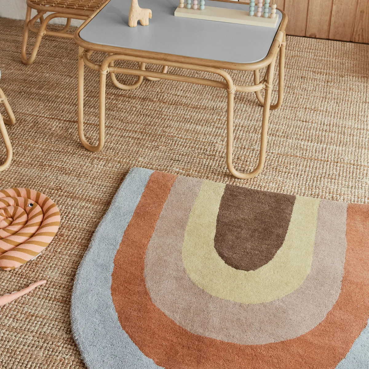 The Rainbow children's rug OYOY in rainbow form provides for good mood and a real eye-catcher in the children's room. The semicircular silhouette of the carpet corresponds to that of a rainbow, so that the colourful stripes are evenly arranged on it.