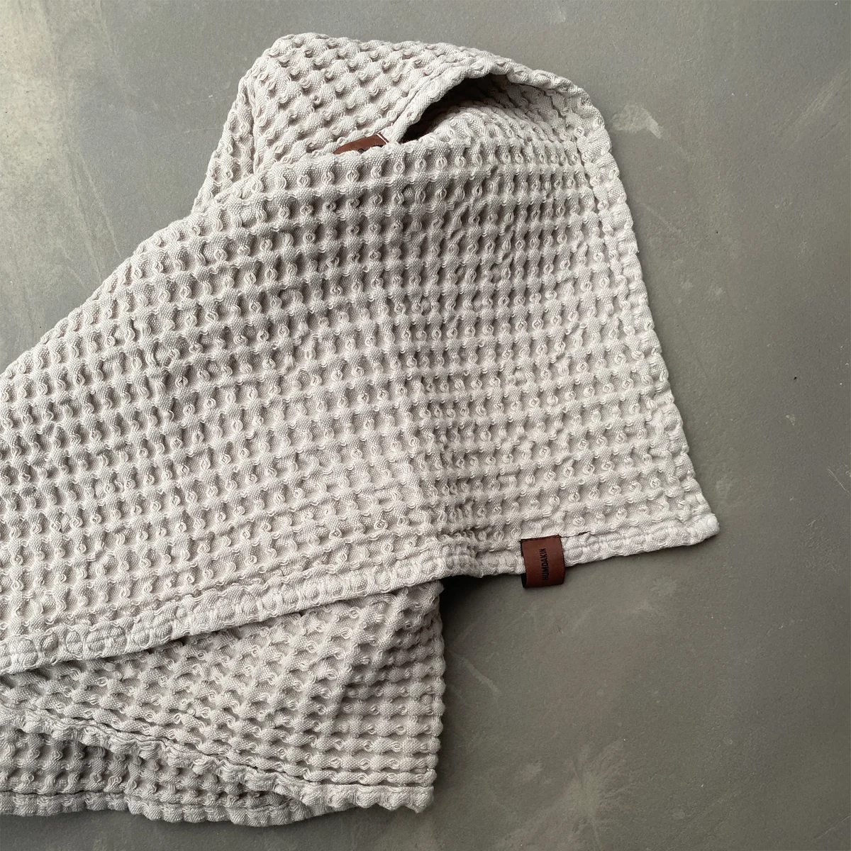 Humdakin waffle structure bath towel is a decorative and functional accessory for the bathroom, swimming pool or beach visit. It dries the body quickly while feeling soft and comfortable. It is made of GOTS certified organic cotton.