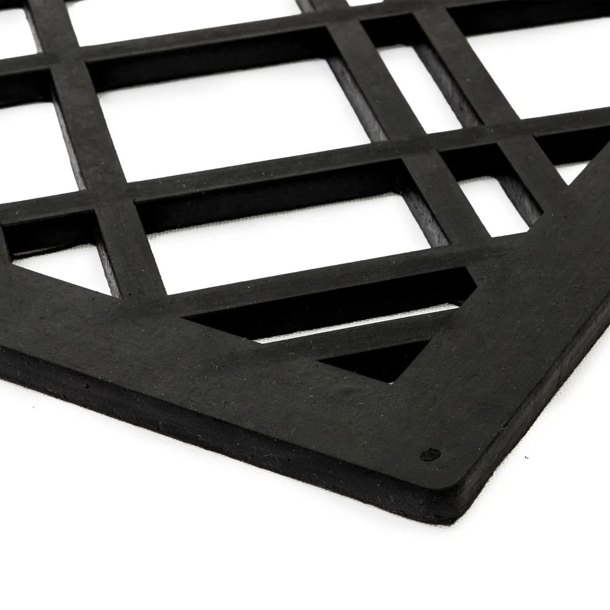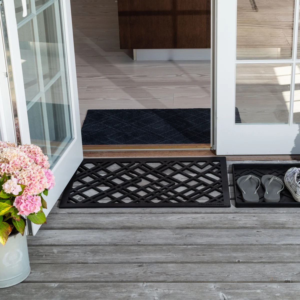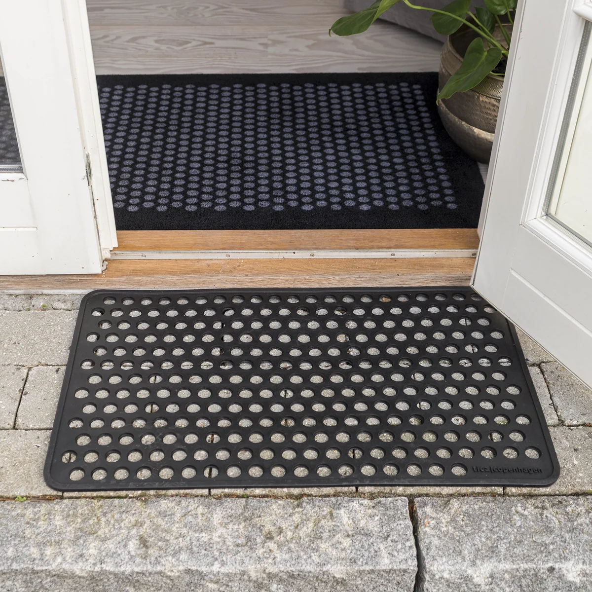 The rubber foot doormat from tica copenhagen is the optimal mat for the entrance area and in front of the front door. The mat is made of 60 % recycled rubber and is therefore quite heavy. This is why the mat lies stable and firm on the floor both indoors and outdoors and does not slip. The mat can be left outside all year round and is easy to clean with a vacuum cleaner or water.