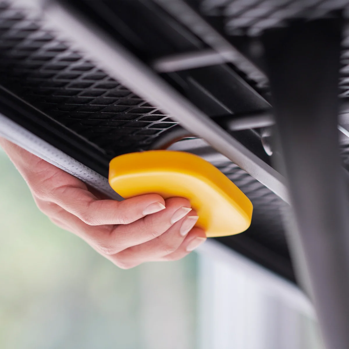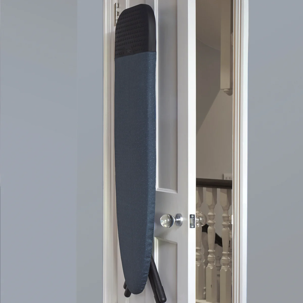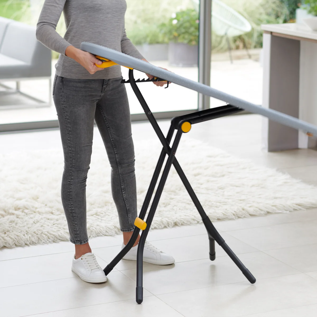 When folded, the innovative folding mechanism ensures that both feet at the end of the board rest within each other. This reduces the likelihood of getting caught anywhere when removing from the cupboard. A large handle on the back also makes it easier to carry and, in combination with the integrated holder, serves as a secure hanger.