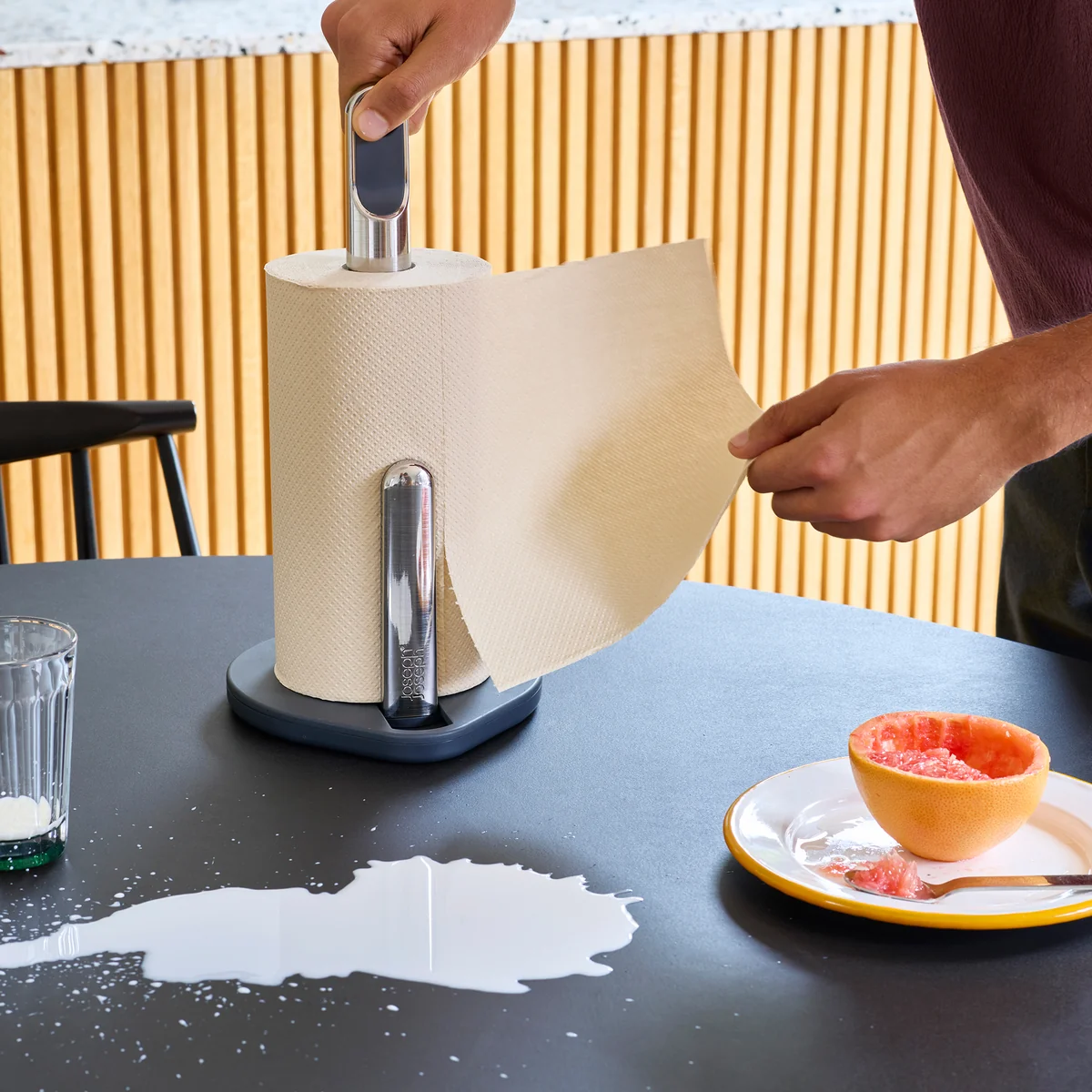 The Hold kitchen roll holder impresses with its functional design for everyday use in the kitchen. The weighted base with non-slip feet ensures stability on any surface. A spring-loaded tension arm reliably holds the roll in position and allows individual sheets to be torn off with just one hand. The integrated carrying strap makes the holder mobile - ideal for being on the spot quickly in the event of spills. Practical, well thought-out and versatile.