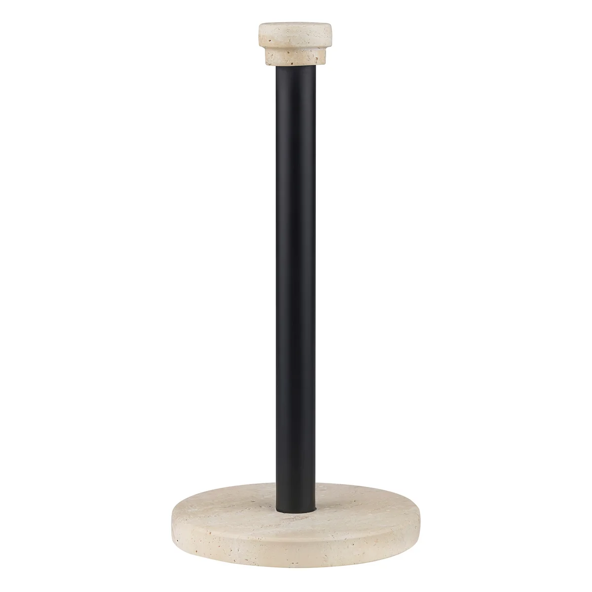 The travertine kitchen roll holder from Mette Ditmer combines functionality with aesthetics. The combination of a base and a knob made of natural travertine gives the holder a warm, organic look. The unique texture and characteristic patterns of the stone provide a stylish accent in the kitchen. The slender rod made of black powder-coated metal harmoniously complements the natural tones of the travertine. Thanks to the sturdy construction and heavy base, the holder remains securely in place and impresses with a perfect blend of practicality and elegance.