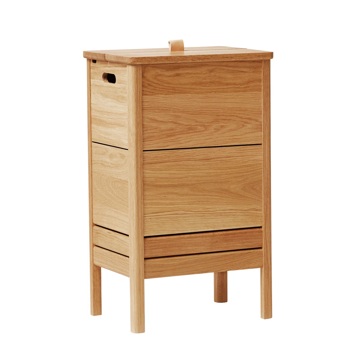 The A Line laundry basket from Form & Refine is a beautiful laundry basket that is made entirely of wood and impresses with practical features: The lid can be lifted with a loop made of leather and stays open to fill the box with laundry. Two slots in the laundry basket ensure that the laundry remains well ventilated. The side-mounted handles make the hamper convenient to transport around the house. Thanks to the basket's low cut legs, the basket brings an elegant lightness to the room.
