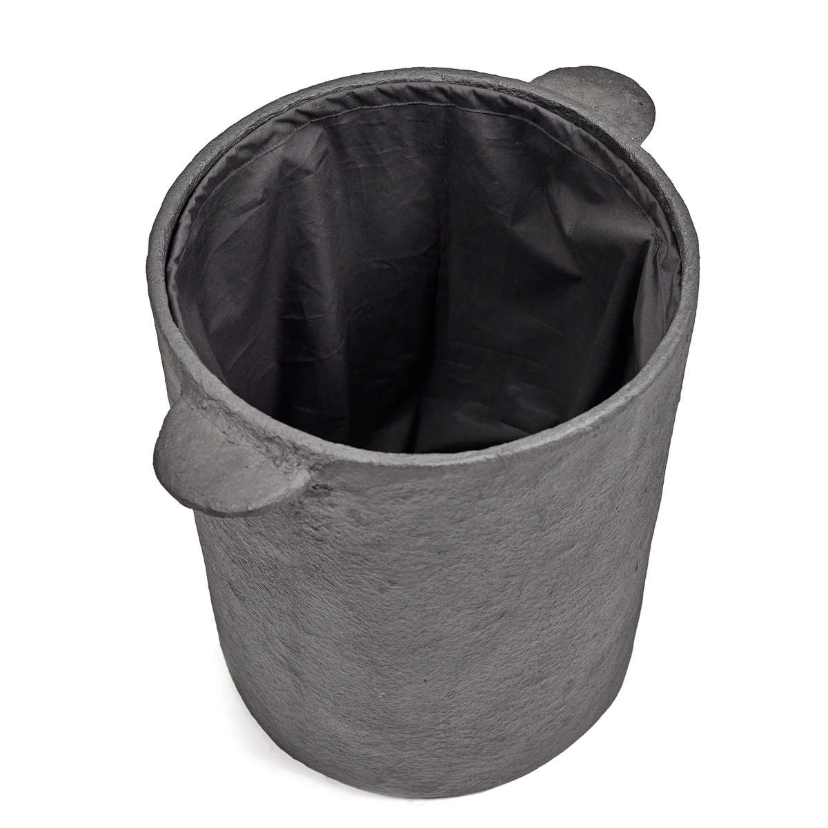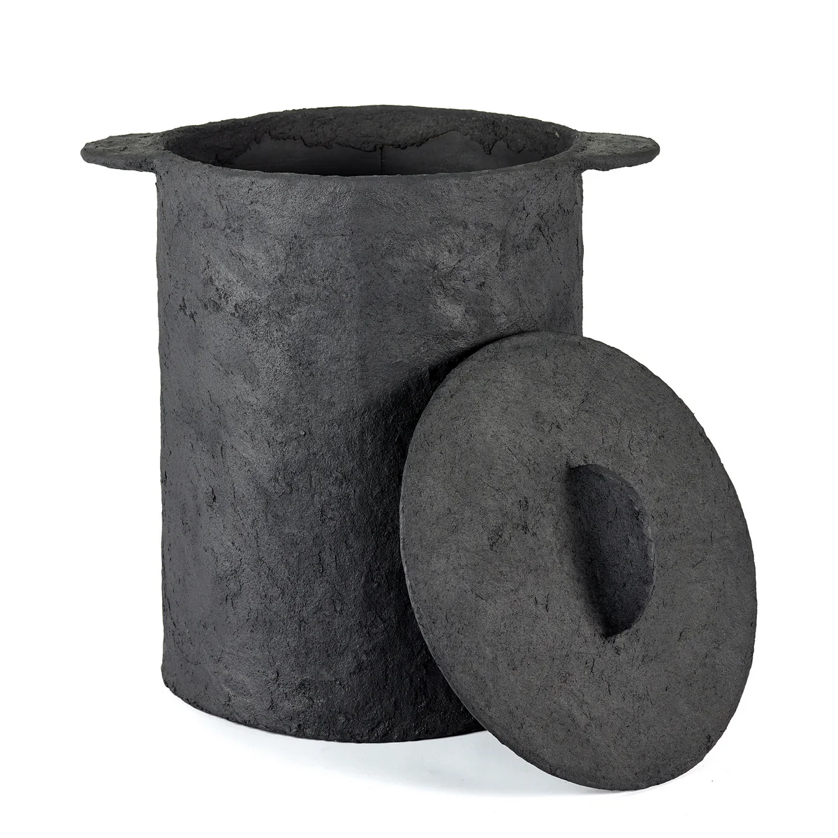 Made from papier-mâché using an elaborate layer-by-layer process, the basket impresses with its expressive structure and organic shape. The deep black coloring underlines the sculptural appearance and gives the object a calm, almost monumental presence. A removable linen bag inside ensures practical convenience, while the matching lid discreetly conceals the contents - ideal for stylish living with attention to detail.