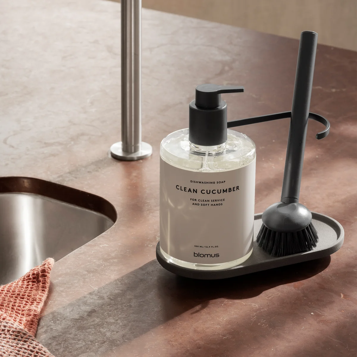 With the Dhuva sink organizer from Blomus , you can bring stylish order to your sink. The high-quality set combines robust materials with minimalist aesthetics: the concrete shelf with PU sealing protects against moisture, while non-slip silicone pads ensure stability and surface protection.