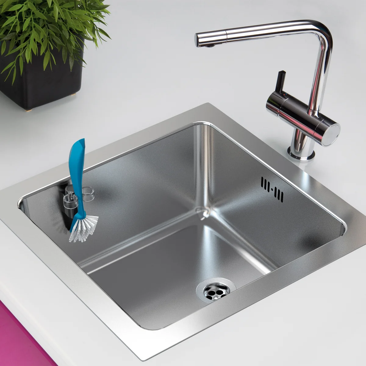 The sink brush holder from Happy Sinks takes unsightly sink brushes out of sight and puts them where they are needed: in the sink. Using a magnetic double construction, the holder holds to the sink without screws or glue and can be moved as needed. The brush is simply pushed between the two rings and held there.