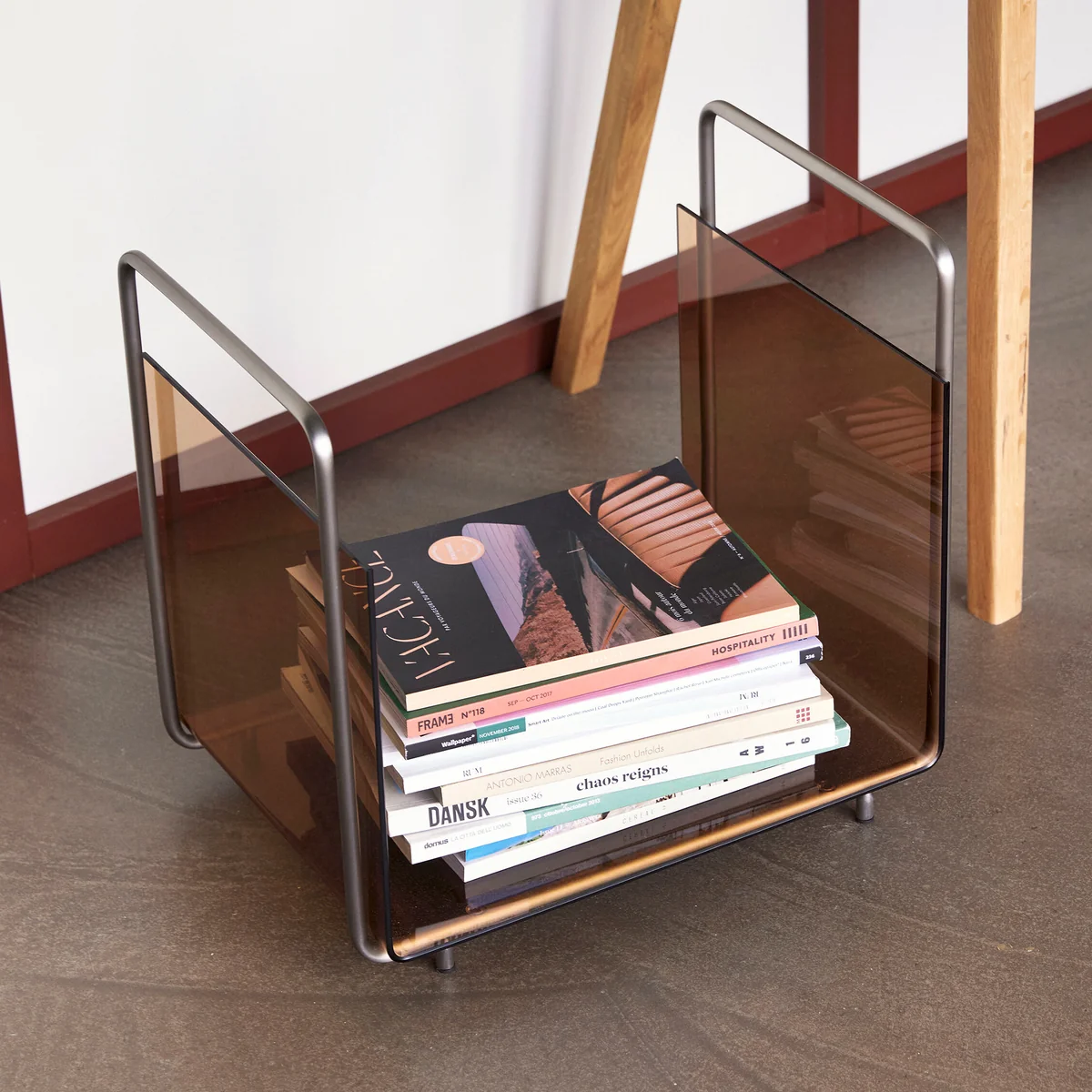 The magazine rack from Hübsch Interior is a practical magazine holder that not only sets chic accents, but also saves a lot of space! Whether in the living room, the hallway or next to the bed, in the bathroom or even in the kitchen - even in waiting areas and cafes, the magazine rack in the noble smoked glass amber look can be used perfectly. The frame is made of nickel-plated steel, the compartment is made of glass.