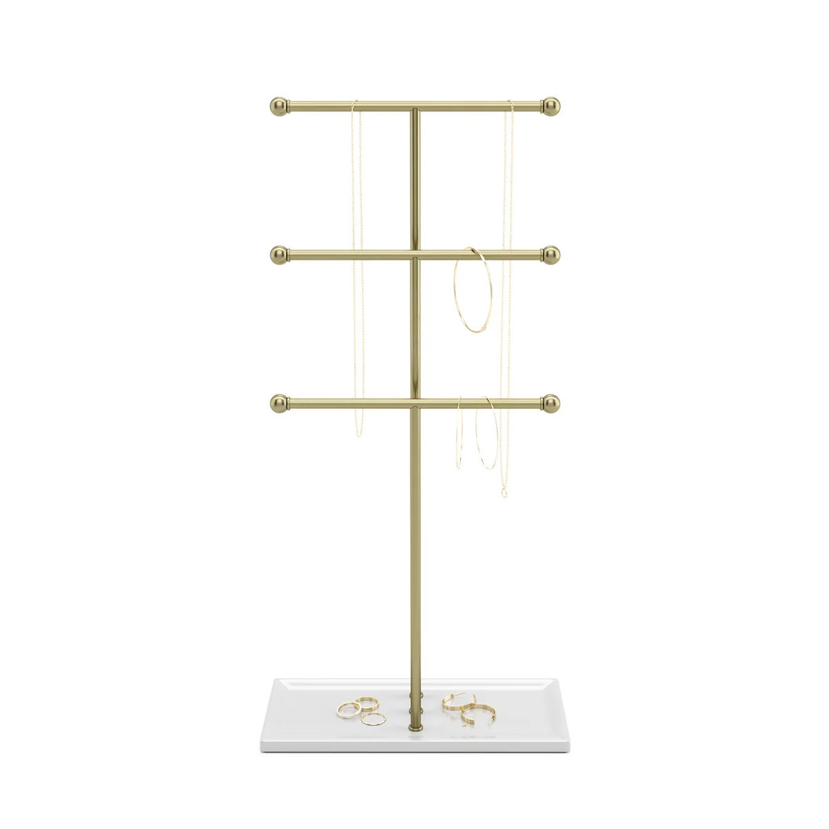 The T-shaped rods are attached to a high-gloss plate, which serves as an additional shelf for earrings and other accessories. The jewelry stand designed by Alan Wisniewski is available Trigem jewelry stand designed by Alan Wisniewski is available in different versions with brass or nickel plating.