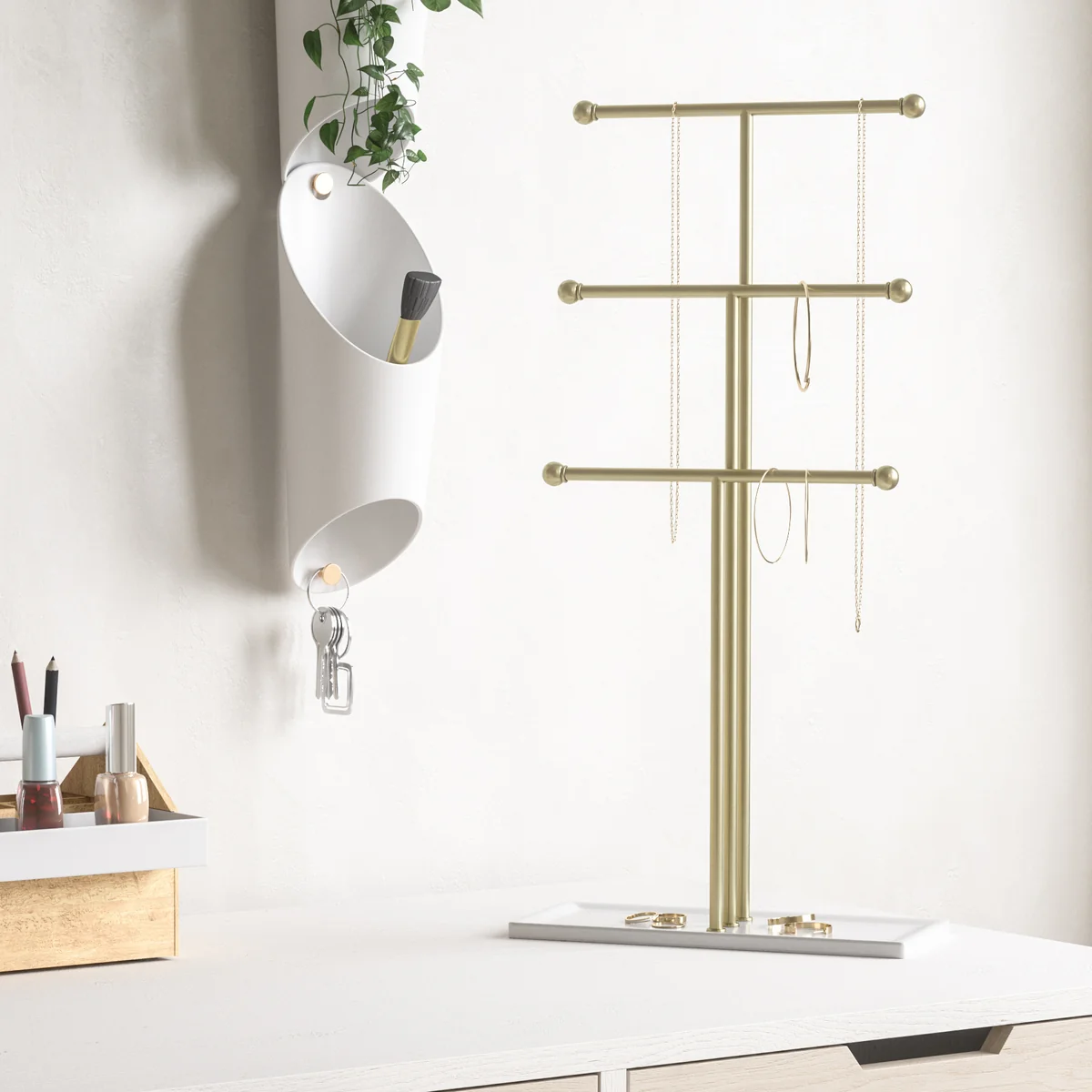 With the Trigem jewelry stand from Umbra allows you to present your favourite pieces of jewelry in style. The three-tiered stand is suitable for arranging necklaces, bracelets, watches and rings clearly on the different levels and also ensures that chains do not get knotted.
