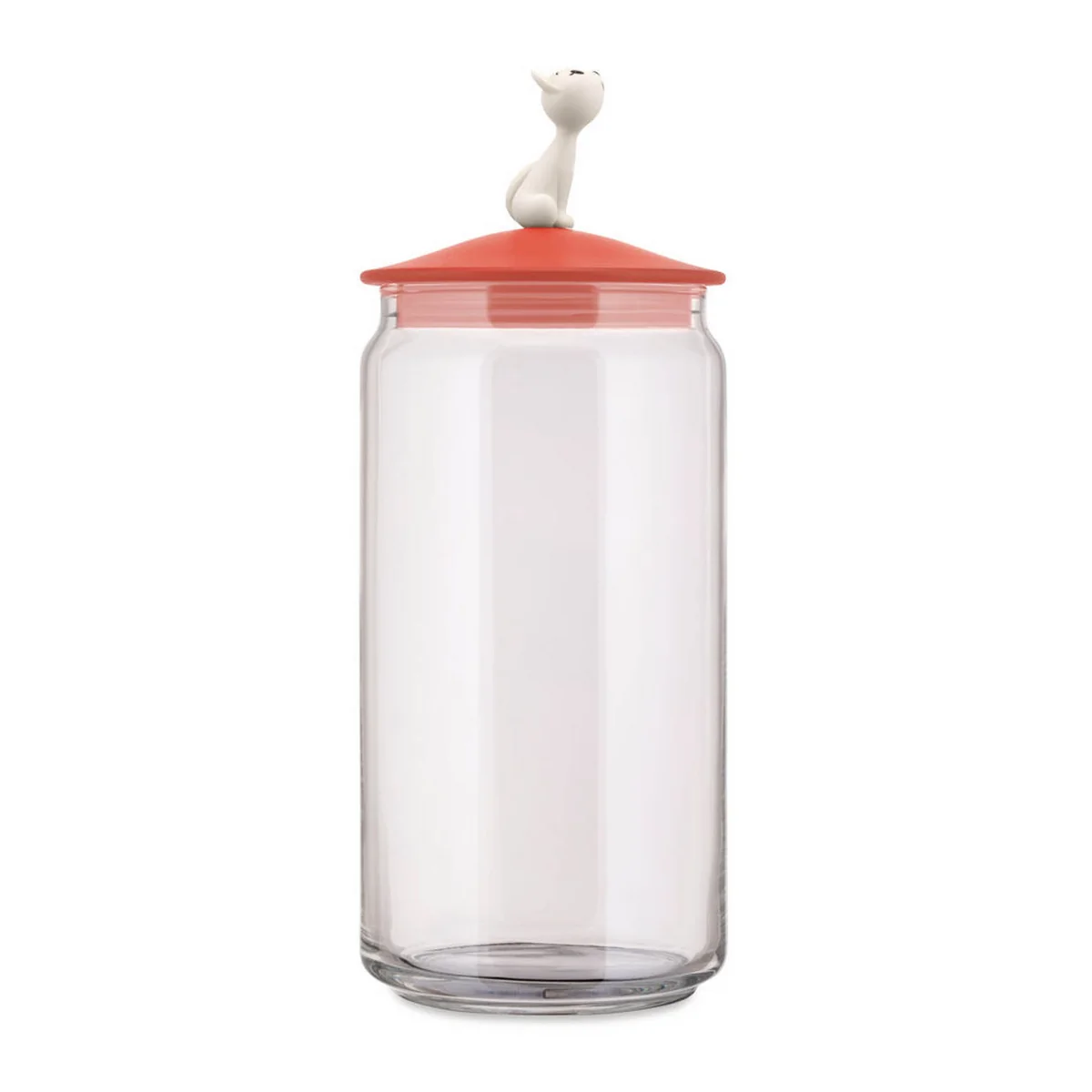 The Miò container for cat food by Alessi is dedicated to the world of pets and adds a playful, emotional feature to a simple everyday object: a small cat on the lid that also serves as a handle.