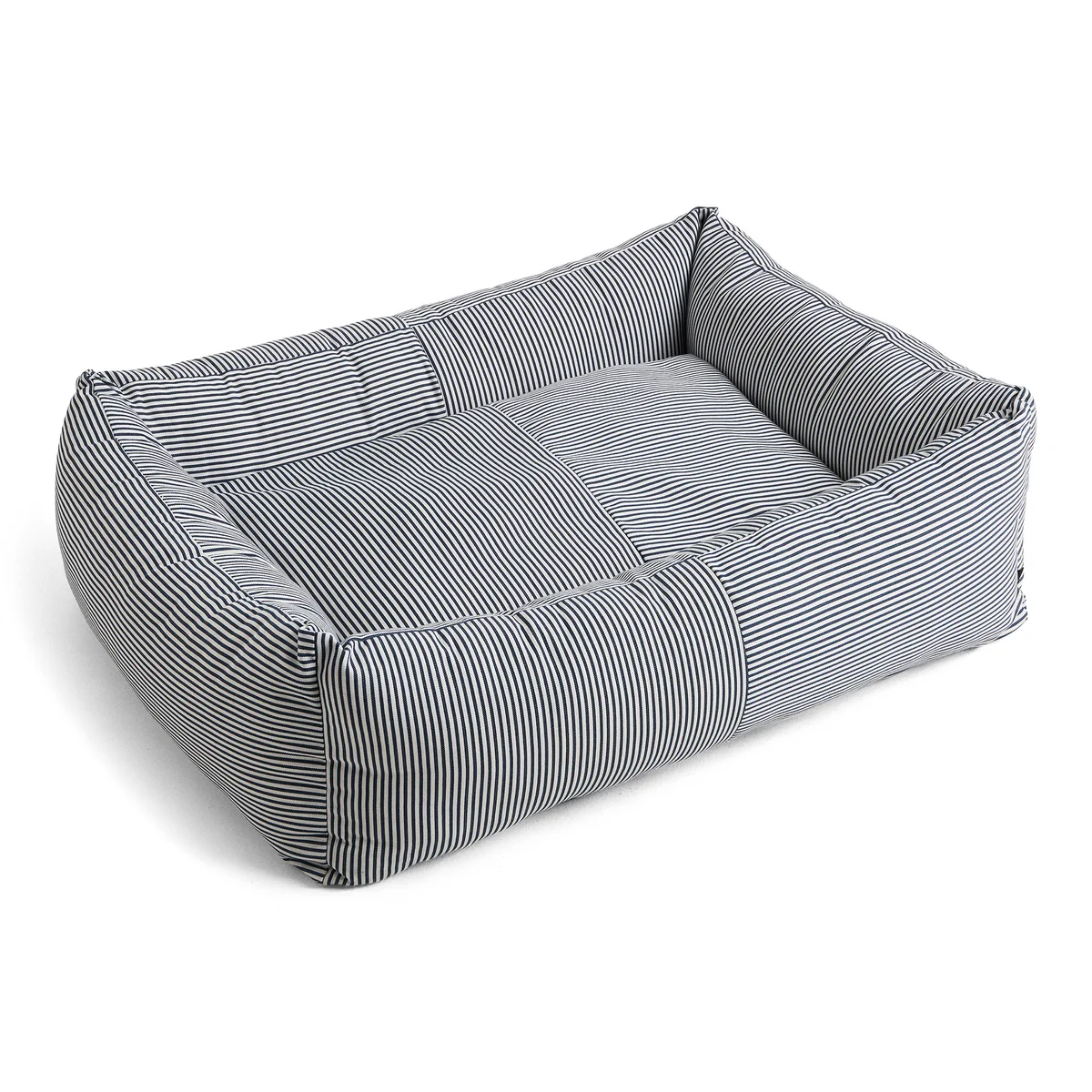The dog bed with its playful color block design is made of sturdy, recycled polyester and a washable, removable cushion filled with recycled polyester. The bed is available in three different sizes in different designs.