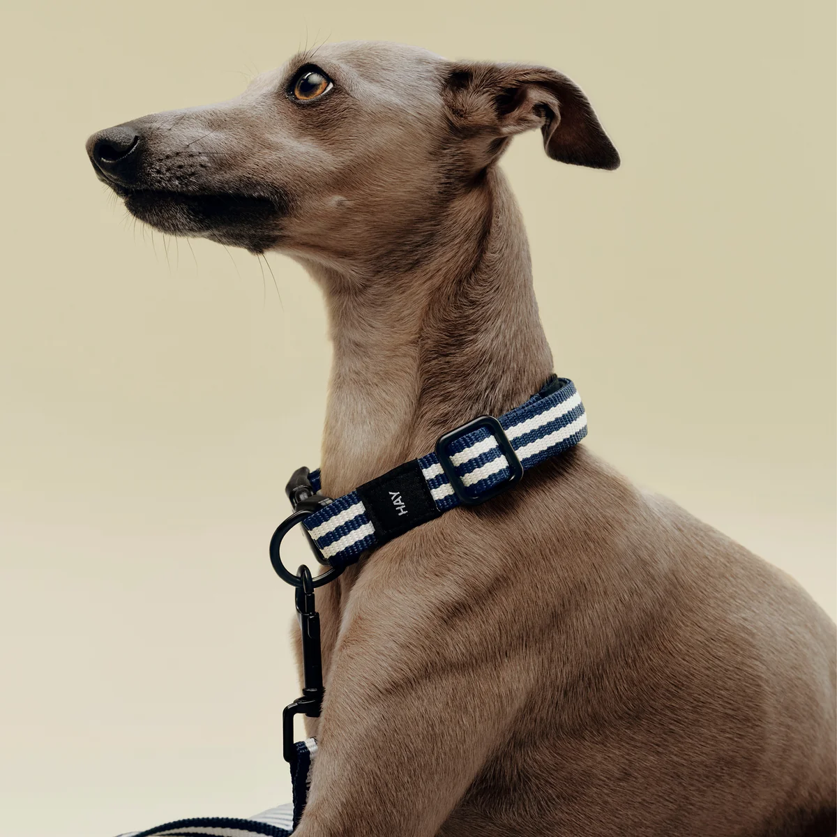 The Dogs dog collar made of robust, recycled polyester is equipped with an adjustable buckle and has additional padding for more comfort. The collar is available in different sizes and features various stripe designs.