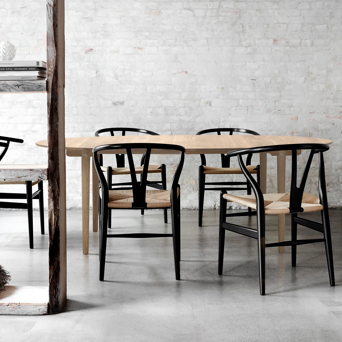 The CH338 from Carl Hansen is a solid oak extendable dining table that invites you to dine with friends and family. Measuring 200 x 115 cm, the table can comfortably seat up to 8-10 people. Thanks to the additional available insert plate with a width of 60 cm, another two people can sit at the table. The CH338 can hold up to two additional insert plates, so the table can be expanded by up to four seats.