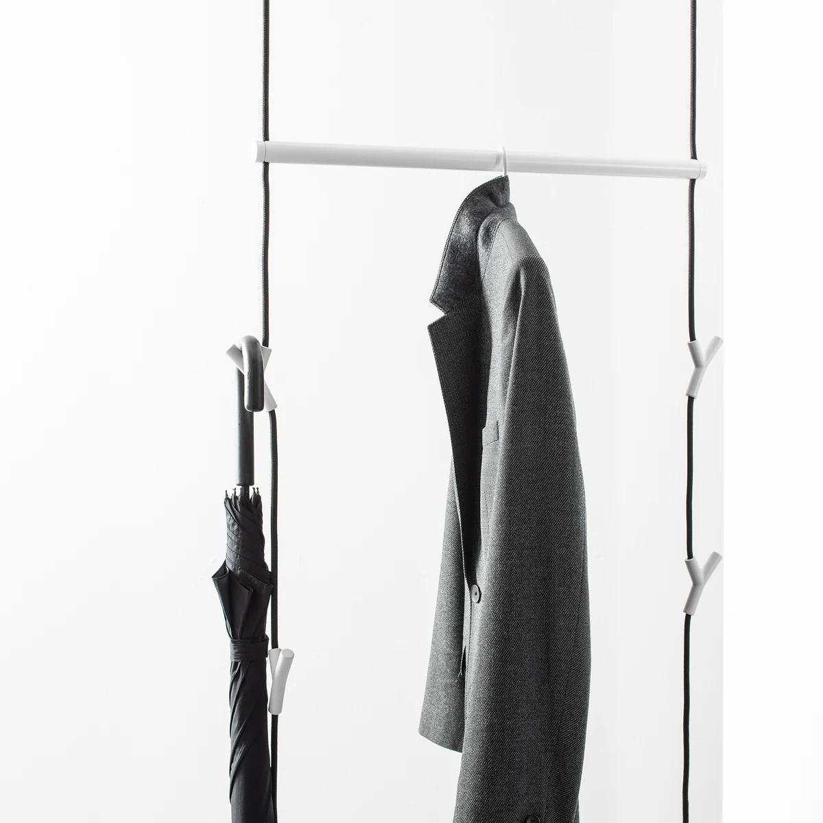 The Wardrope coat rail from Authentics is a modern and smart clothes rail. Equipped with two screws on the side, it can be easily mounted between two Wardrope ropes to guarantee a stable suspension for all clothes. Together with the ropes it offers an unimagined number of possibilities to vary the wardrobe.