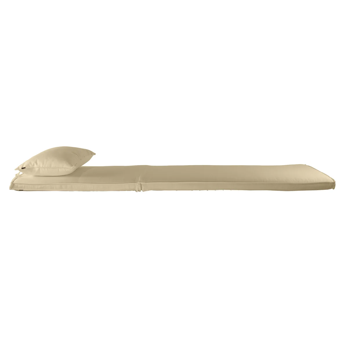 The cushion and the pillow give the Korfu sun lounger from Jan Kurtz a high degree of additional comfort. After all, the cushion is 5 cm thick. To keep the cushion in the right place, it can be attached to the headboard of the sun lounger.