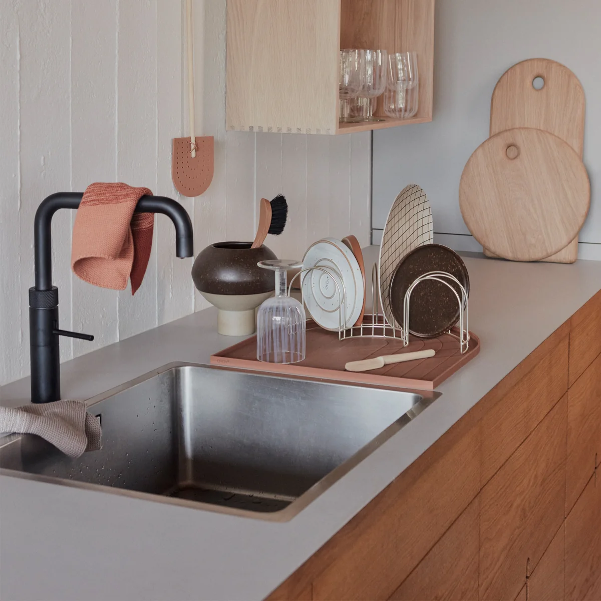 The drip mat from OYOY is a suitable accessory for the drip rack from OYOY . In the set, washing the dishes by hand becomes child's play. In the shape of a rainbow, the mat made of silicone protects the sink and the work surface in the kitchen from dirt and dishwater. The mat is particularly practical in combination with the draining rack. The dishes placed on the rack dry quickly and reliably.