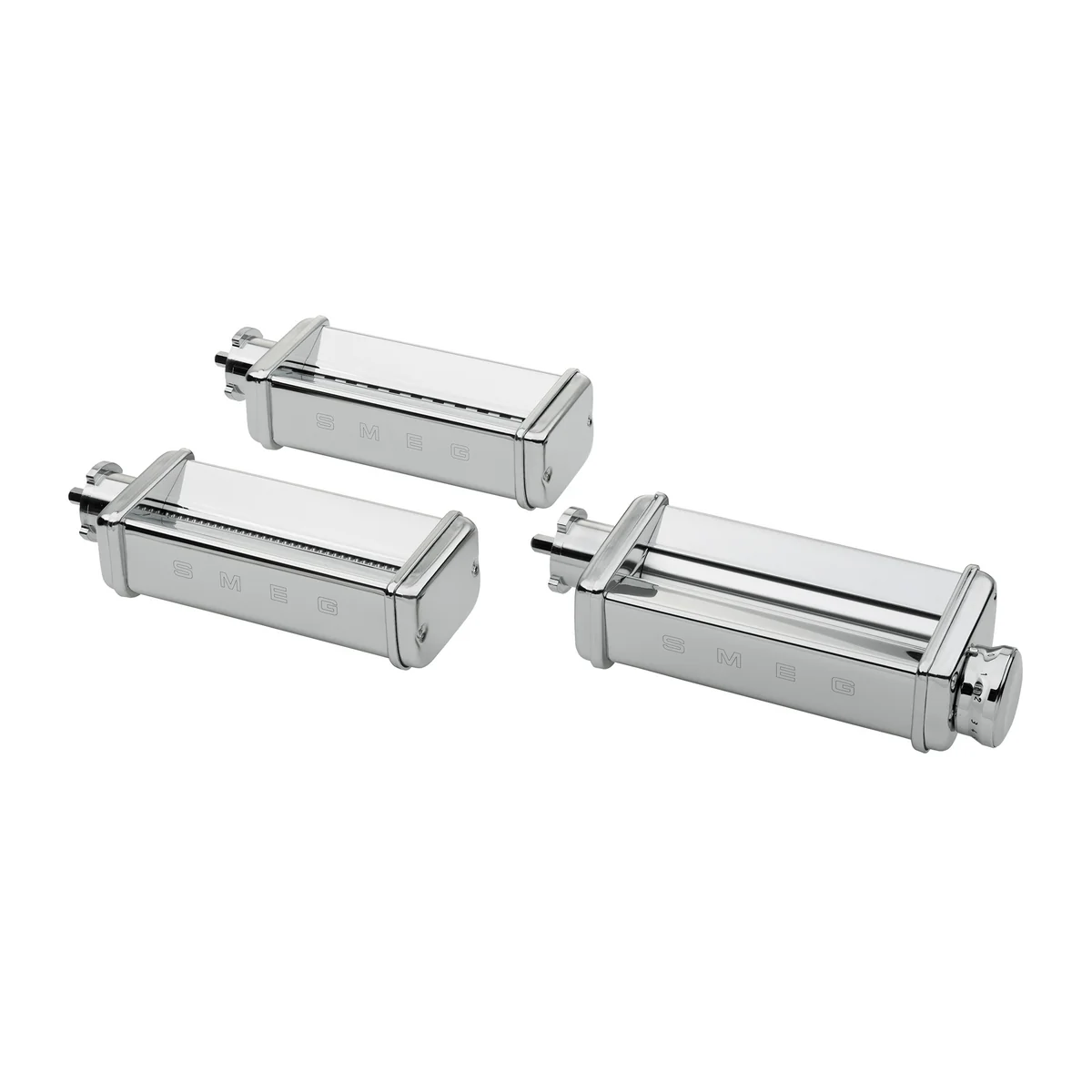 To prepare pasta with the Smeg kitchen machines, the practical attachments are ideal for different types of pasta. They are simply mounted on the front attachment of the machine and the dough previously kneaded in the mixing bowl can already be processed.