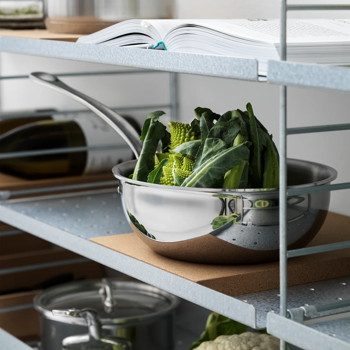 The bottle compartment from String is a practical accessory for the String shelving system and keeps wine or champagne bottles in the kitchen in a safe place on the String shelf. The bottle compartments are made of ABS plastic or cork, depending on the variant, and hold all bottles securely in one place thanks to their wave shape. This way, nothing can slip off the shelves.