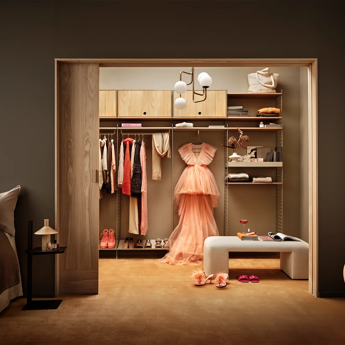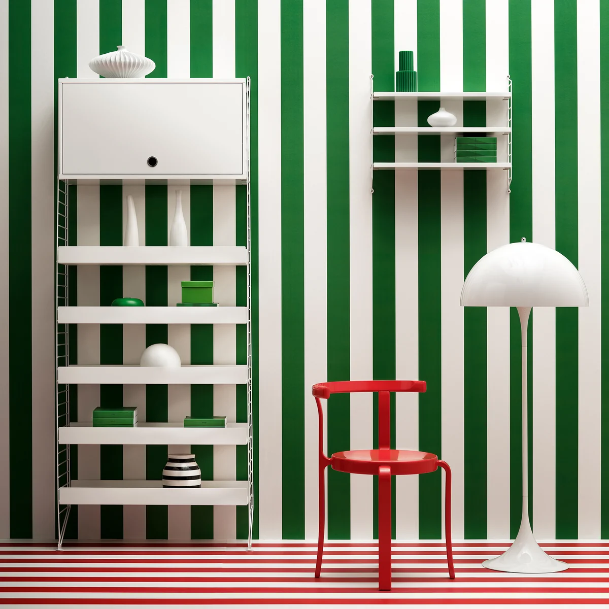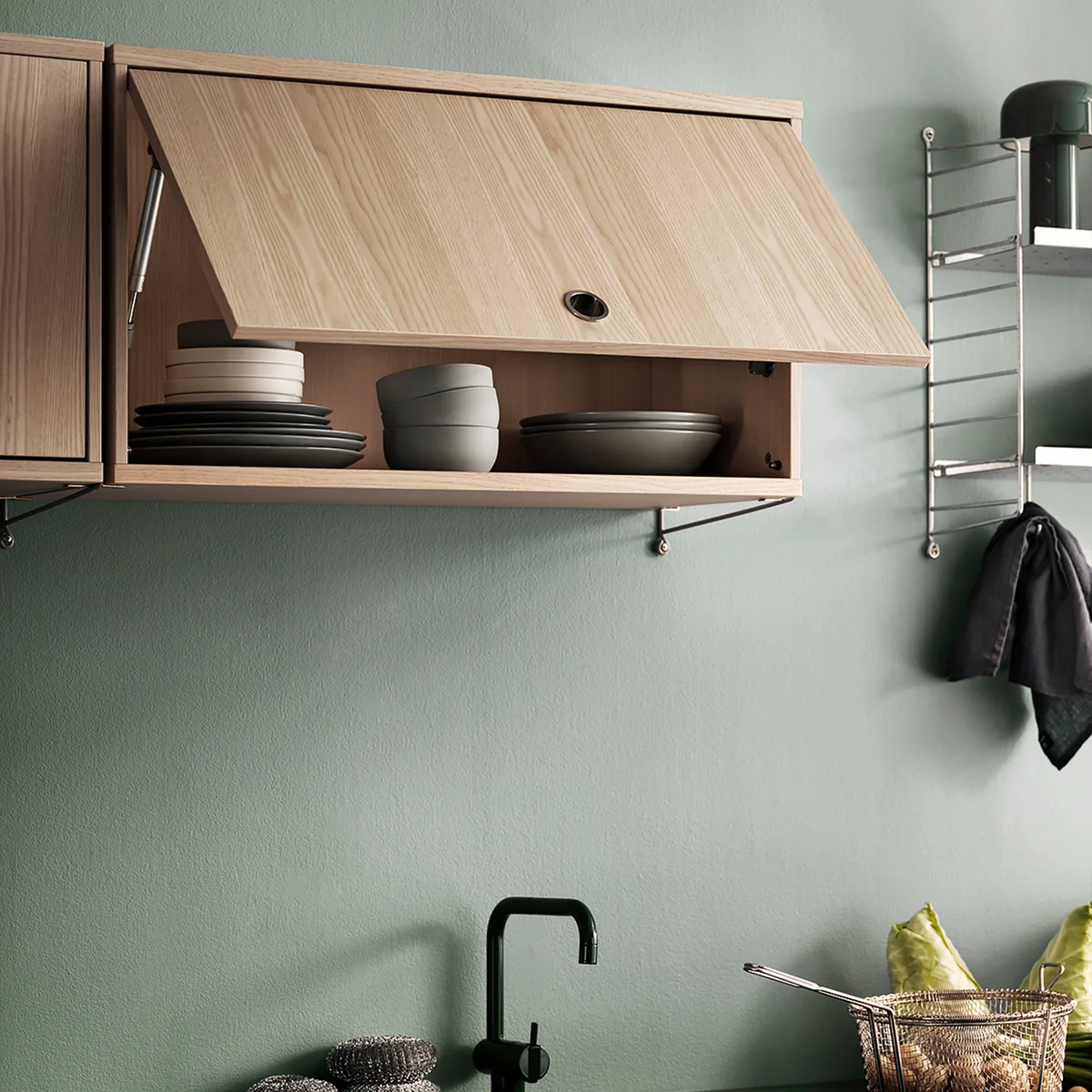 The wardrobe element with hinged door from the manufacturer String impresses with its versatility. The minimalist cabinet has a width of 78 cm and a depth of 30 cm. The height of the cabinet is 42 cm. It also has an adjustable inner shelf and can be fitted with 30 cm deep shelves as required. The wardrobe element with hinged door can be fitted in the living room, bedroom, bathroom or kitchen as desired.