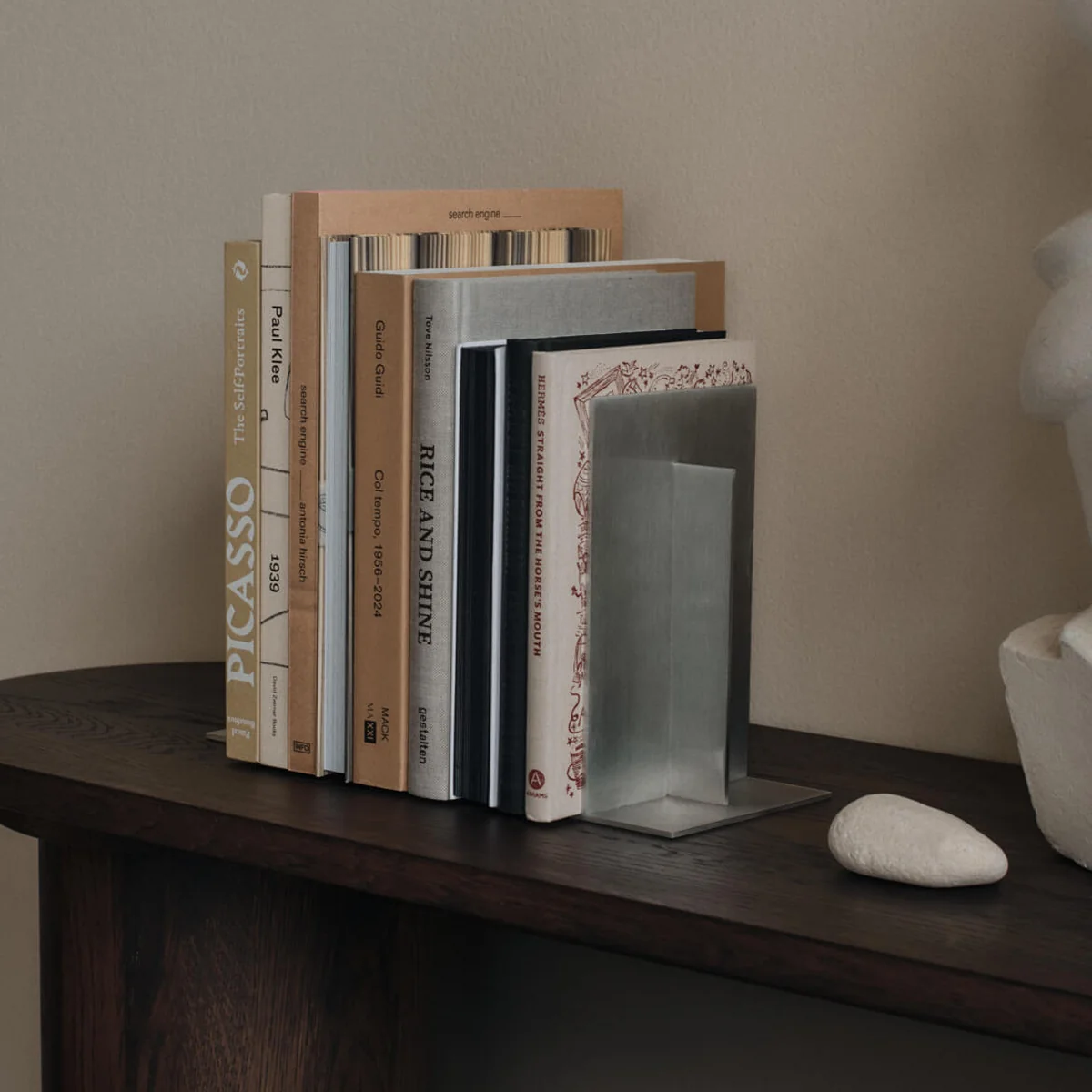 With its clear design language and brushed surface, the Lager bookend from Ferm Living brings a calm, industrial elegance to the shelf. The geometric design sets structuring accents and adds an architectural touch to any bookshelf. Whether used functionally or arranged as a stylish object, the bookend combines visual strength with understated expressiveness and blends harmoniously into modern interiors.