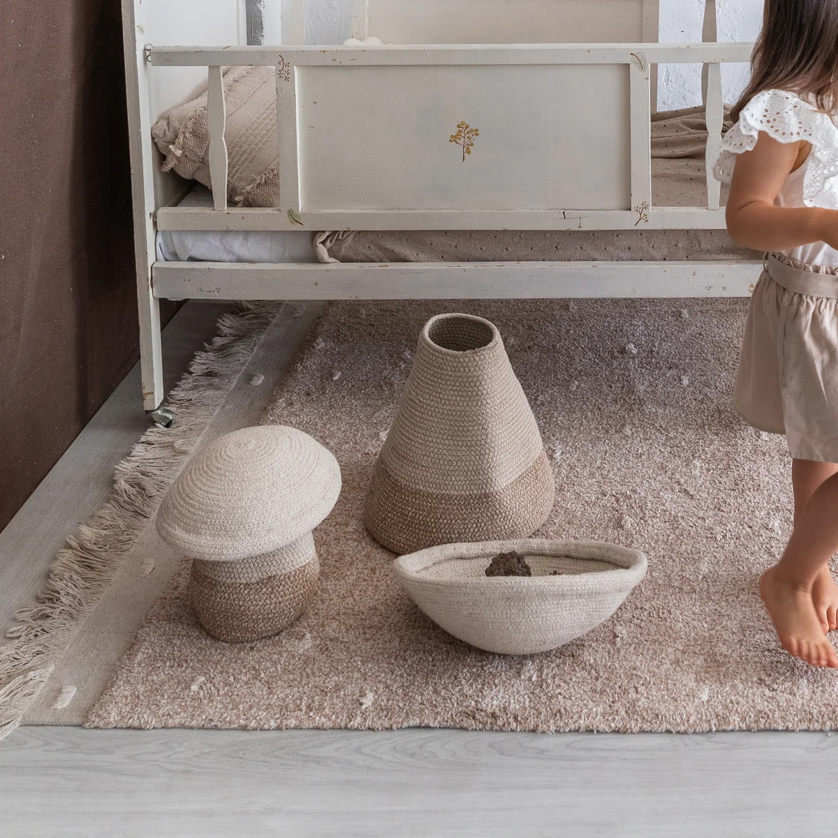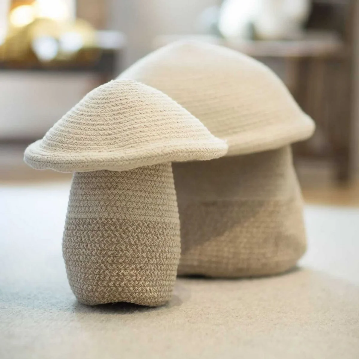 Minimalist mushroom storage basket made of cotton.