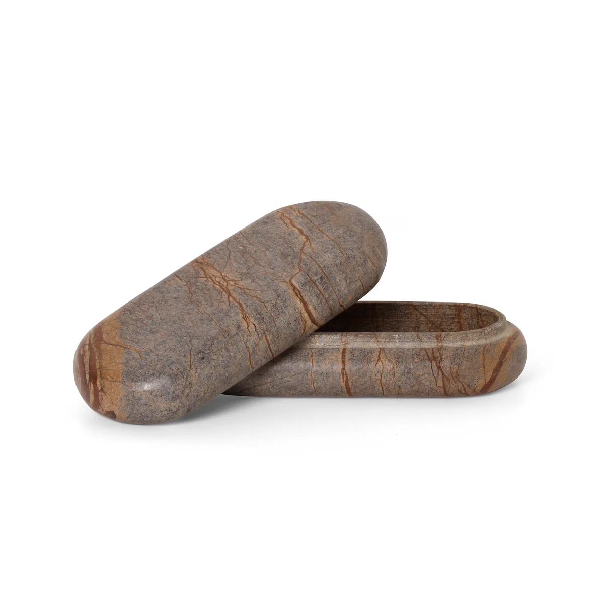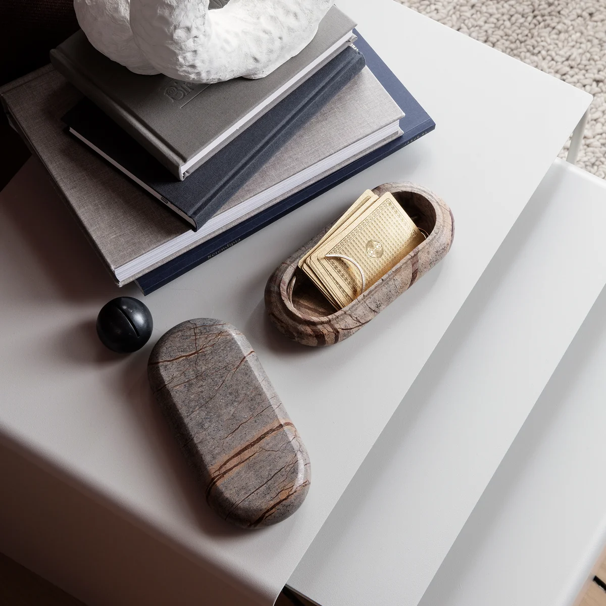 The Bendum Box from Ferm Living is a box made of high-quality Bidasar marble and belongs to a whole series of living accessories made of this material. The brown marble underlines the soft curves of the box, which makes a good jewellery box.