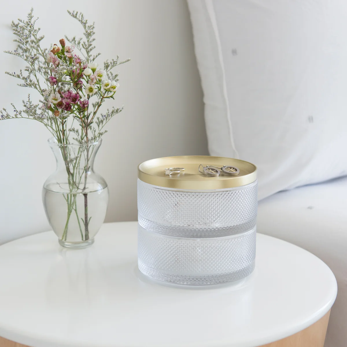 The jewellery box consists of two bowls that can be stacked on top of each other. While the bowl is made of marbled white resin or glass, the lid is optionally coated with brass or nickel. The favourite pieces of jewellery are stored safely and in a space-saving manner and the contrasting materials also provide a decorative eye-catcher.