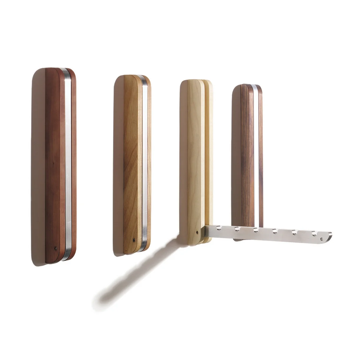 The wall hook is available in oak wood, pear wood, maple wood, cherry wood and walnut wood.