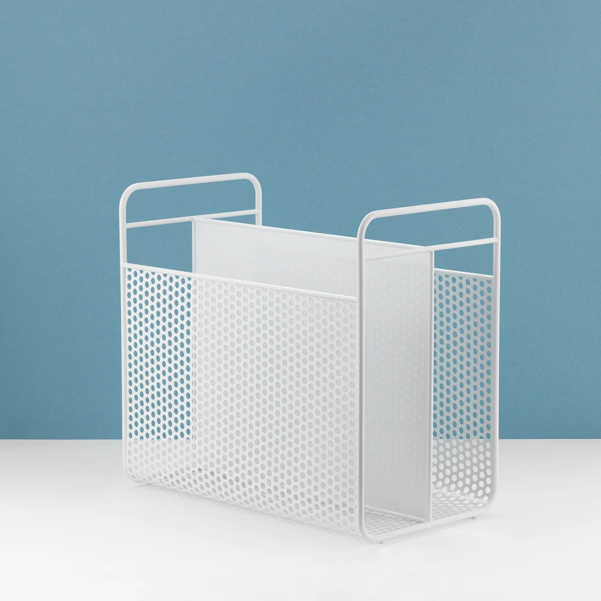 The digital world however, is what Simon Llegald inspired. The perforated sides of the magazine holder can be found in ventilation systems for computers from the 90s. In General, the magazines holder’s form is rather simple and modern in design. The powder-coated steel gives the magazine collector an industrial touch, which can be combined versatile.