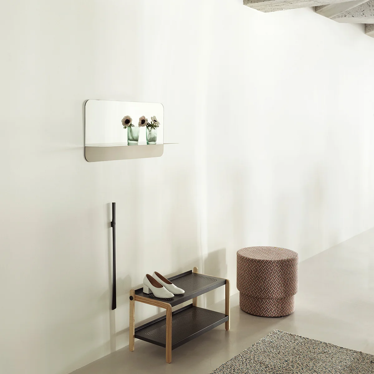 The horizon tale Horizon mirror from Normann Copenhagen was designed by Kaschkasch Cologne and is a wall mirror with an integrated steel shelf on which keys can be placed as well as accessories: glasses, jewelry or perfume. Thus, the mirror is a real all-rounder, which is a welcome guest in the bathroom as well as in the hallway.