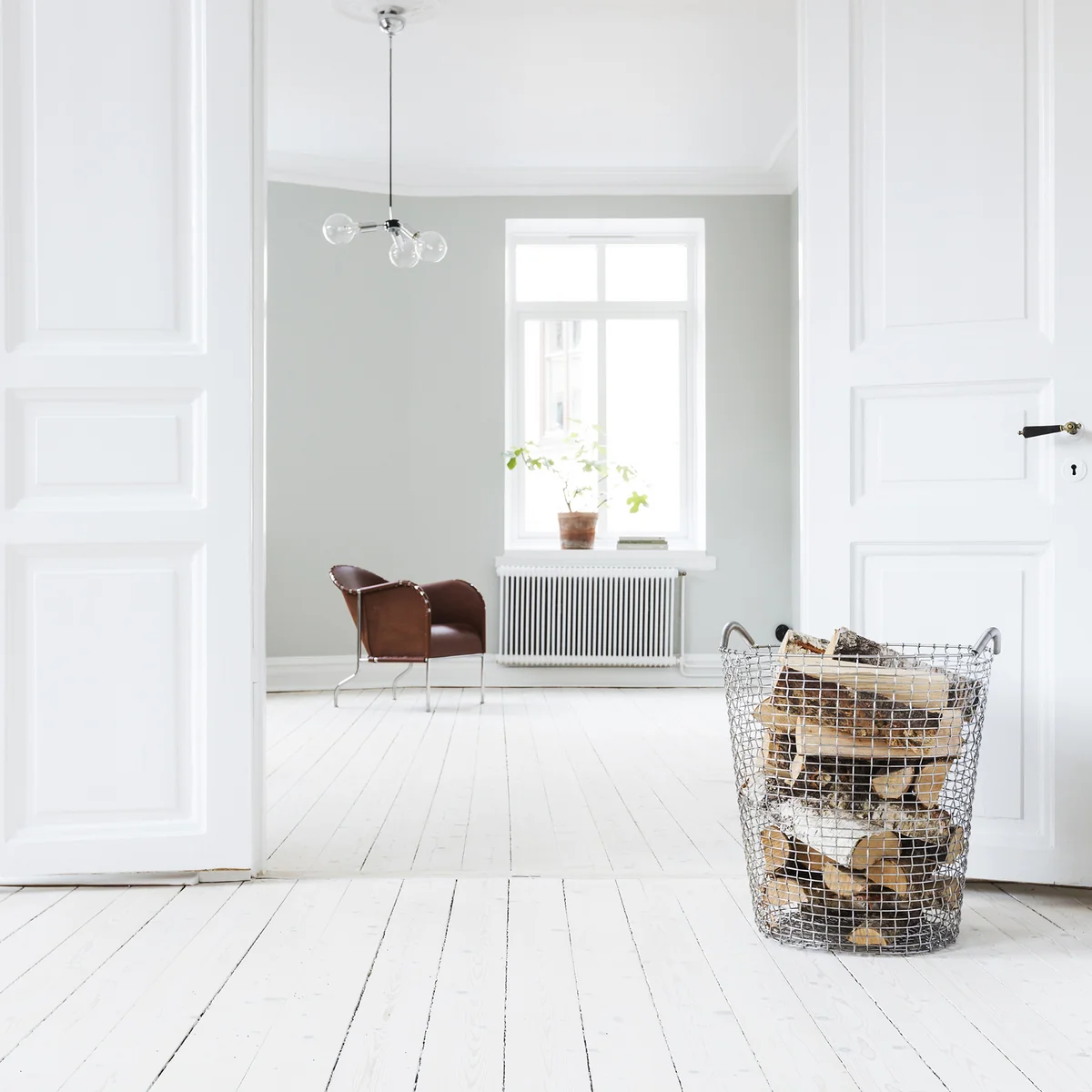 The Korbo baskets are available in two types of steel: galvanised steel or stainless steel. Both types are rust-free. The galvanisation process in which a physical barrier of zinc is laid on the surface prevents corrosion Galvanised steel has been successfully used for over 150 years and the wire will get a nice, matt patina over time. Stainless steel in contrast contains nickel and molybdenum which form a completely rust-free combination with the steel. In contrast to galvanised wire stainless steel is not only protected from corrosion on the surface but is completely rust-free. The stainless stainless baskets remain shiny no matter which environments and weather conditions they are exposed to. Hand-woven baskets. The hand-woven baskets are all made with exactly the same technique. This unique construction consists of a single long wire which is woven by hand without using welding equipment. Accessories The basket can be used in many ways with different accessories and fittings. A laundry basket with a cloth lining, a flower pot with a plant bag or simply to store newspapers, wood, toys and many other things.