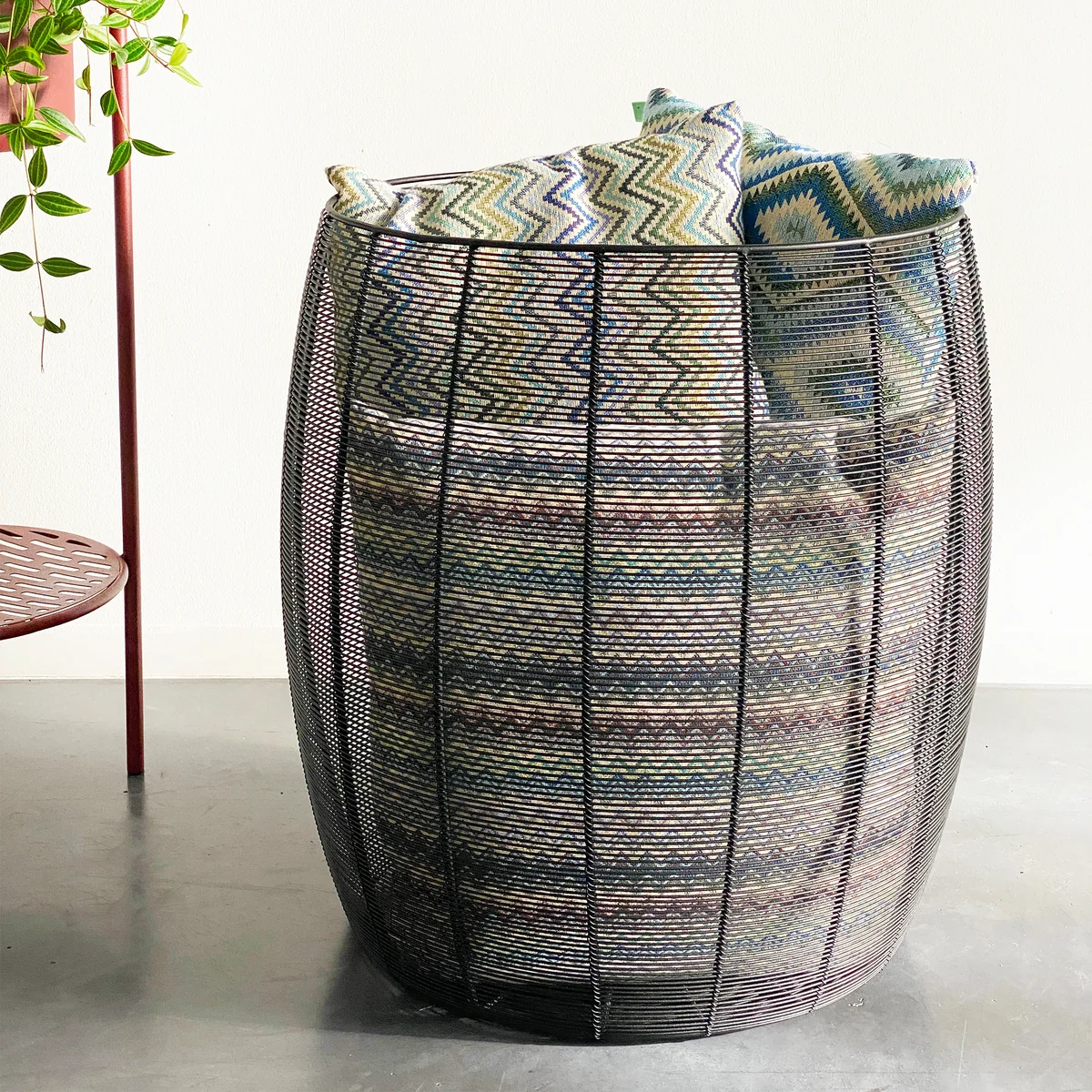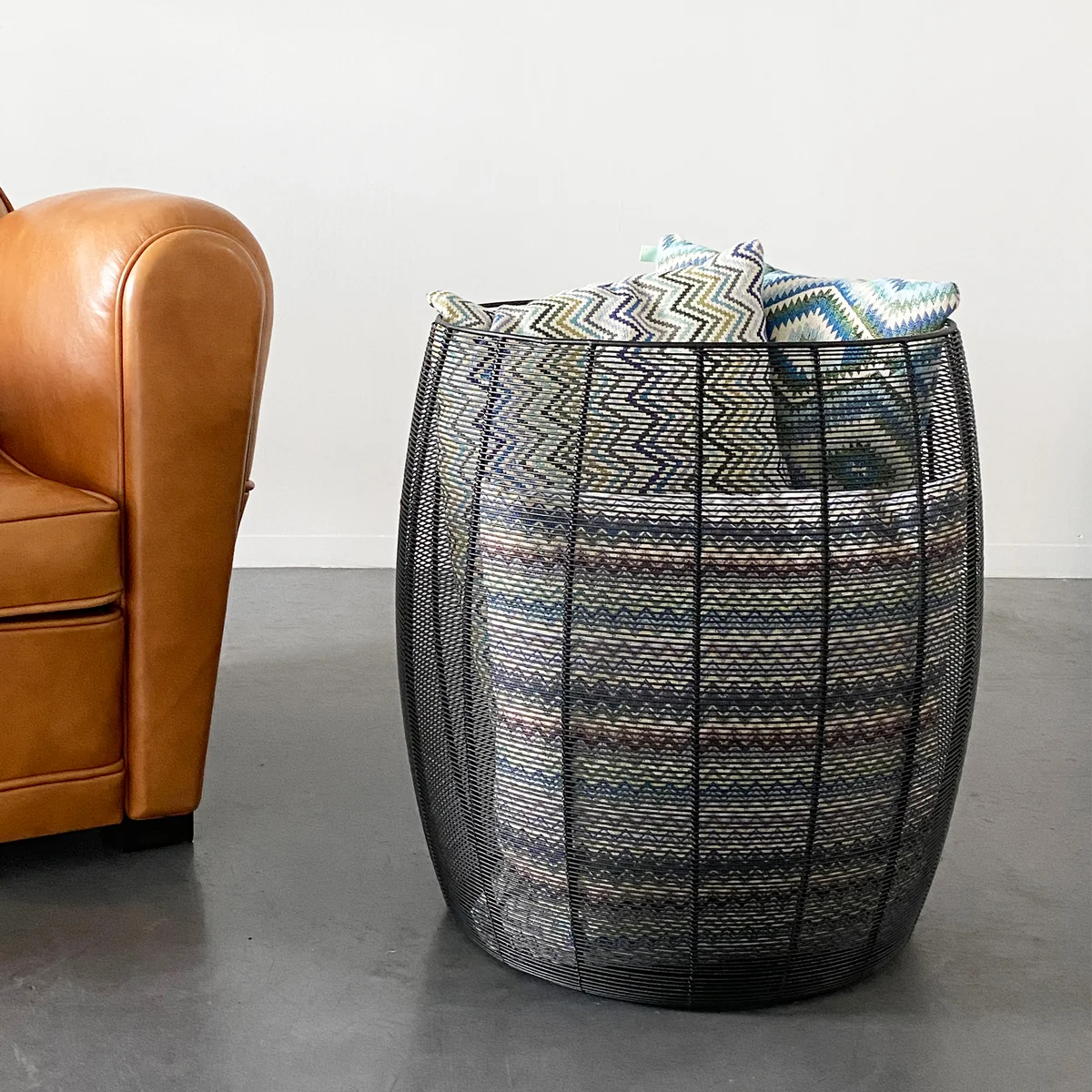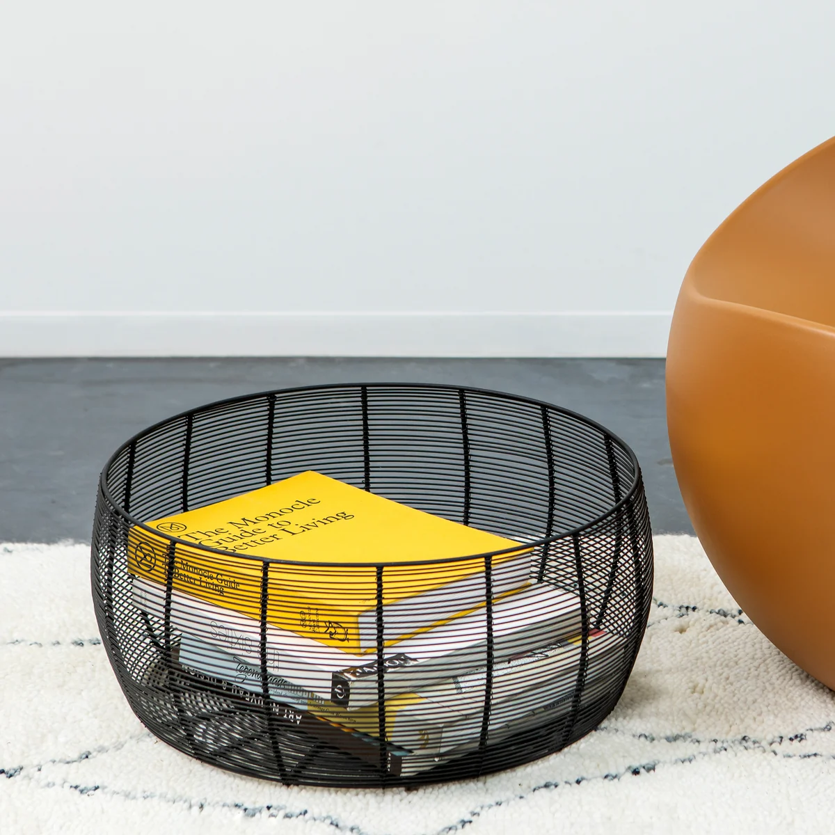 The Dora Basket from XLBoom is a metal storage basket that beautifully collects everyday items like magazines or scarves in one place.