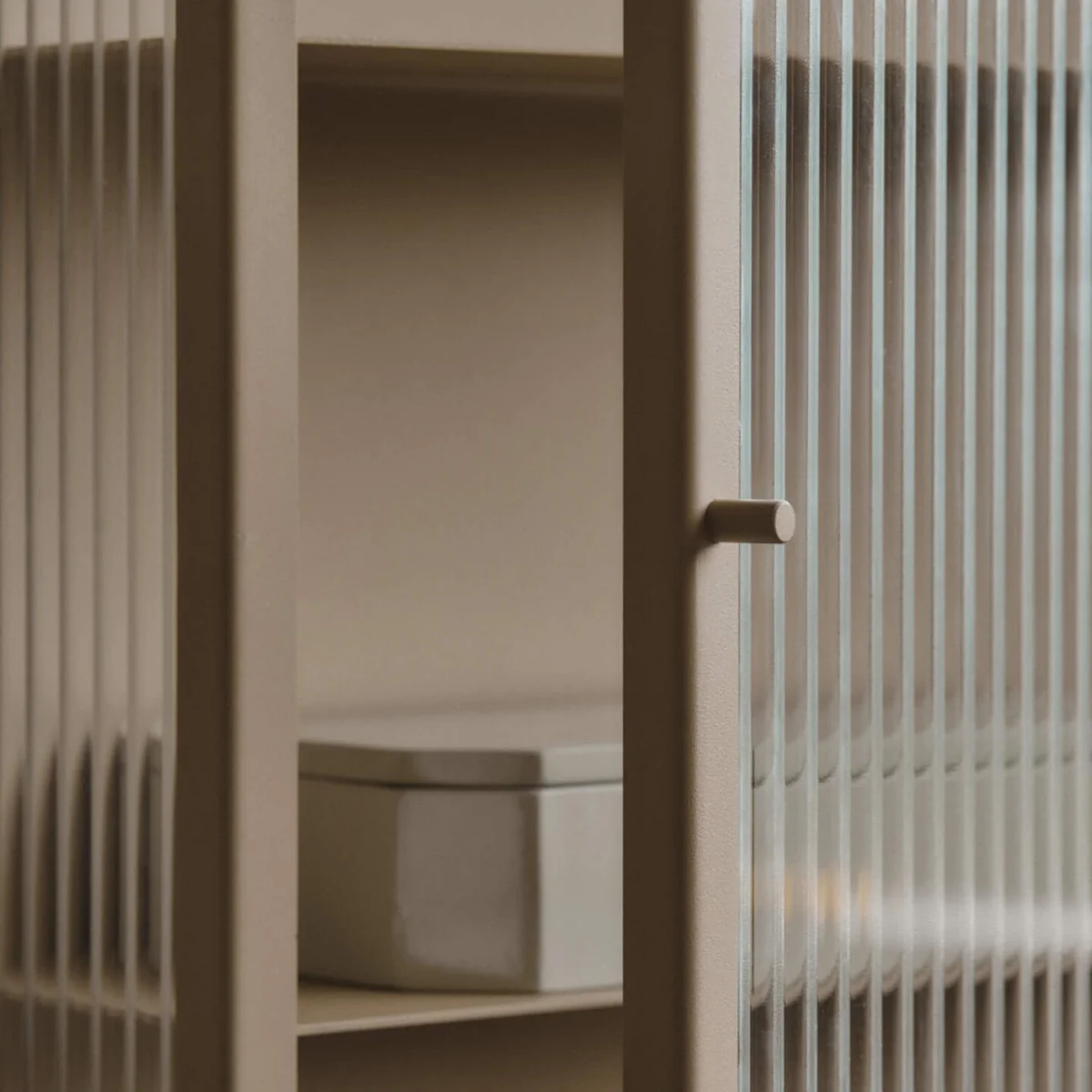 The Haze wall cabinet from Says Who is made from a frame of powder-coated steel and wired glass and brings a completely new design language to the Ferm Living range.
