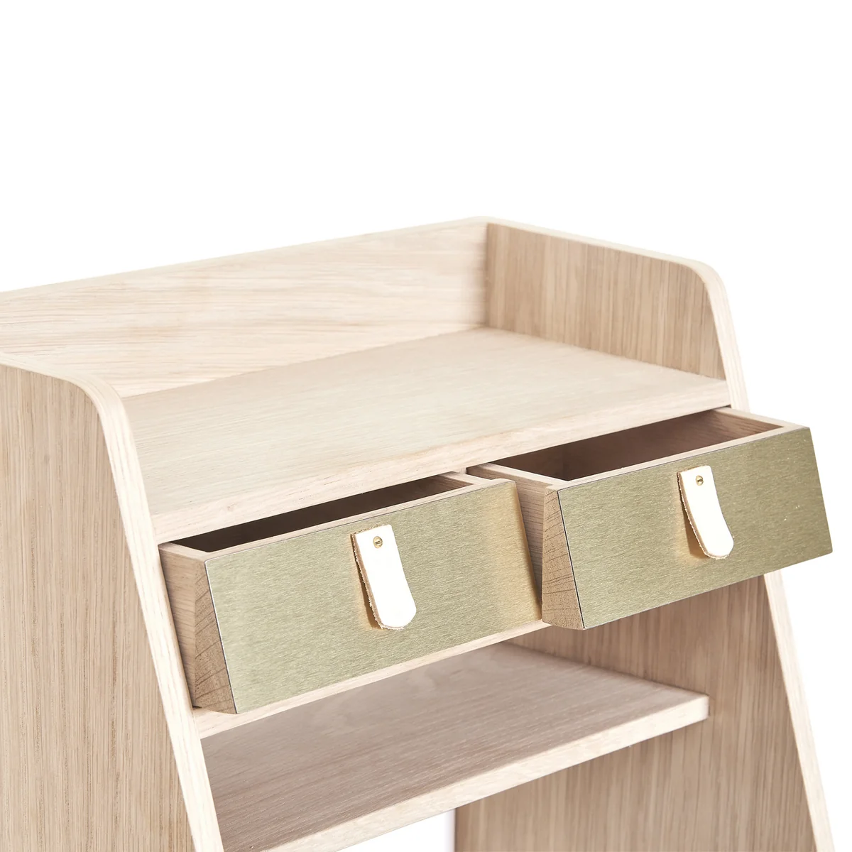 The Suzon Wall shelf by Florence Watine for Hartô is made of veneered MDF oak or MDF walnut, which is treated with natural matt lacquer. Leather tongues facilitate the extraction of the drawers, whose fronts are available in colored lacquer or brushed brass.
