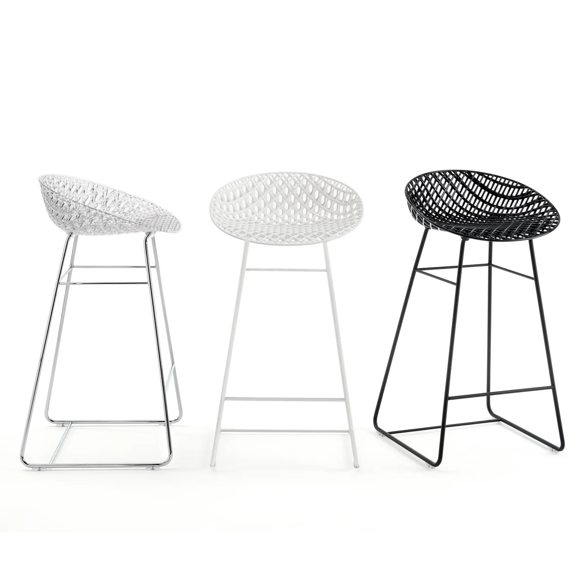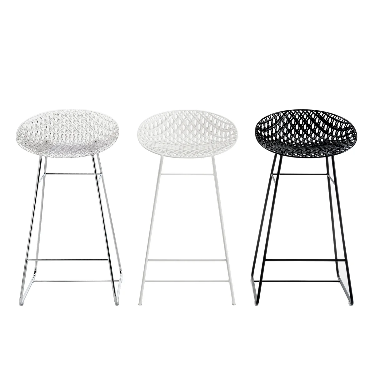 The Smatrik bar stool from Kartell combines exceptional design with innovative materials and special structures. The bar stool was designed by Tokujin Yoshioka, who created a three-dimensional effect with the seat shell of the bar stool. It makes the chair extraordinary and gives it lightness and refinement. With a seat height of 65 cm, the bar stool is particularly suitable for an elevated dining island in the kitchen or for use at the in-house bar. The bar chair is also an eye-catcher in public areas such as hotel lobbies or bars.