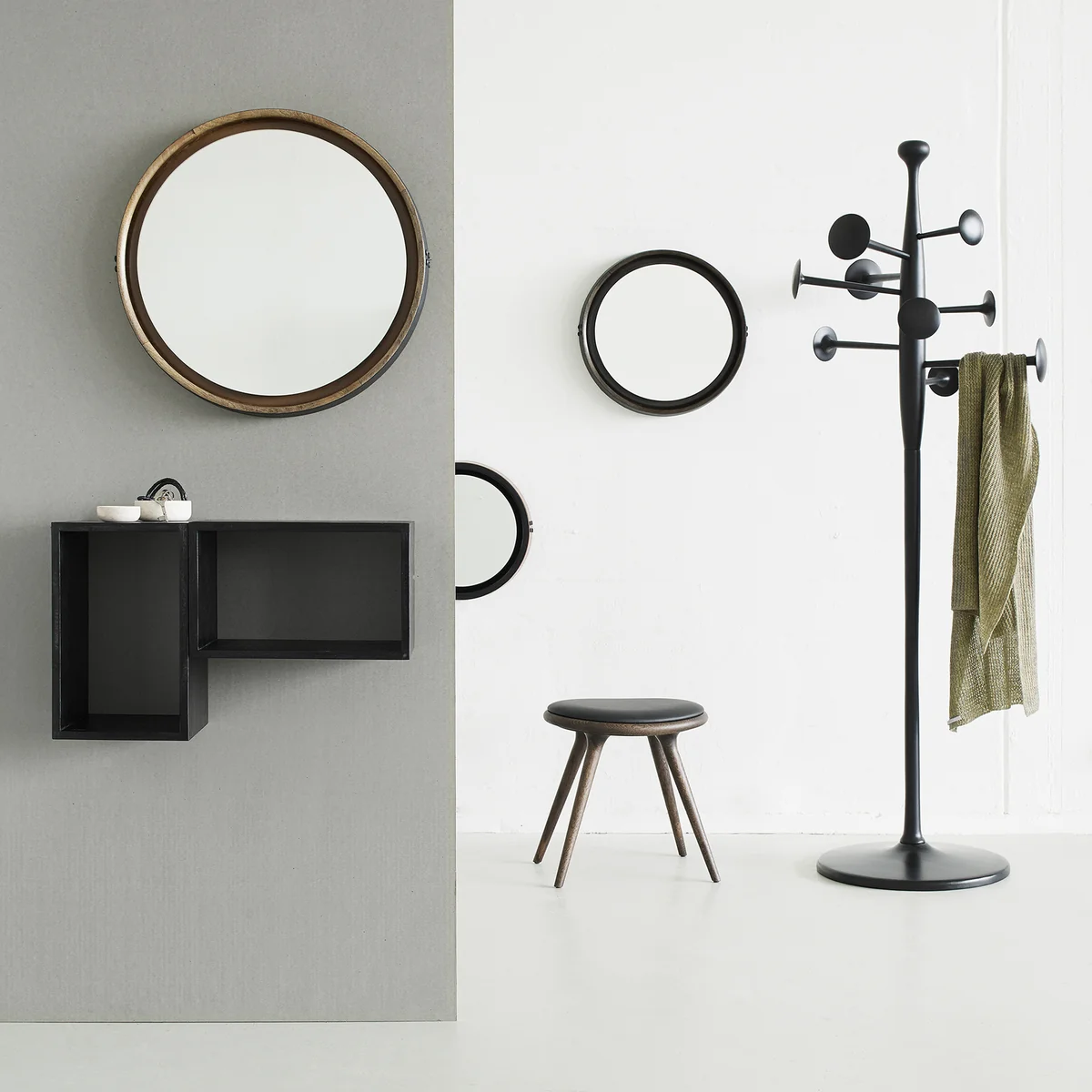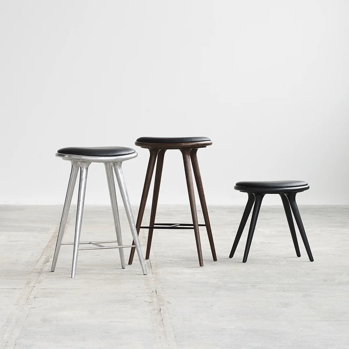 The stool by Mater is available in 47 cm, 69 cm and 74 cm-high versions. The stool’s legs can be made of dark or black stained beech wood, stained or soaped oak wood or recycled aluminium. The seat on all stools is made of high-quality leather.