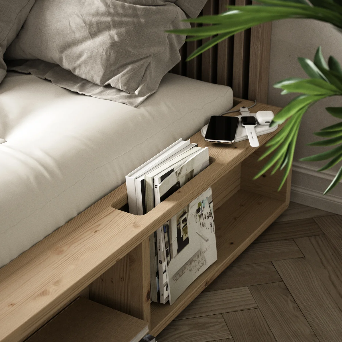 During the development of the Ziggy bedstead of the Danish manufacturer Karup Designs great emphasis was placed on materials and functionality. This resulted in a solid bed frame made of FSC®-certified pine wood, which thanks to clever savings on the sides offers plenty of storage space for books, smartphone and other everyday items.