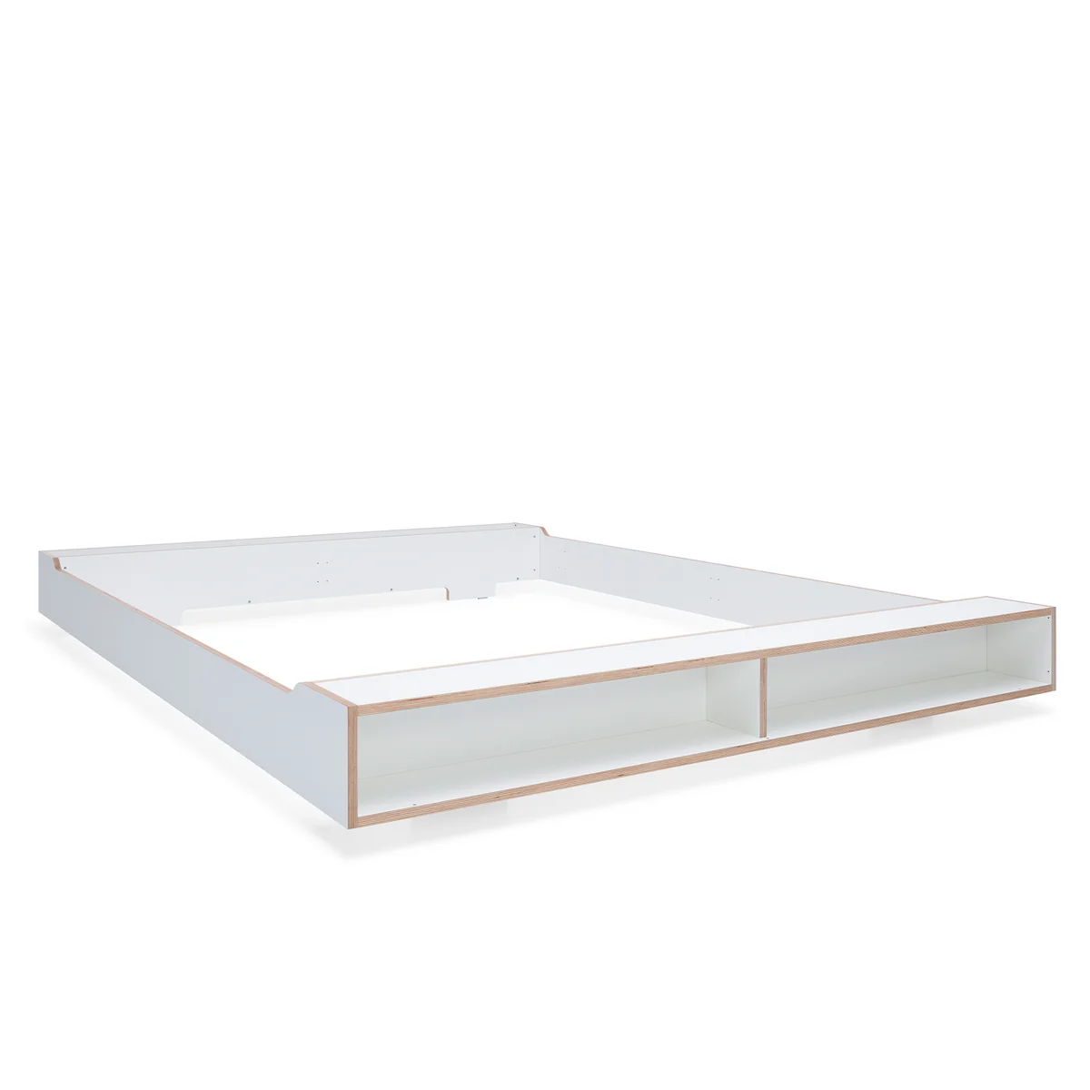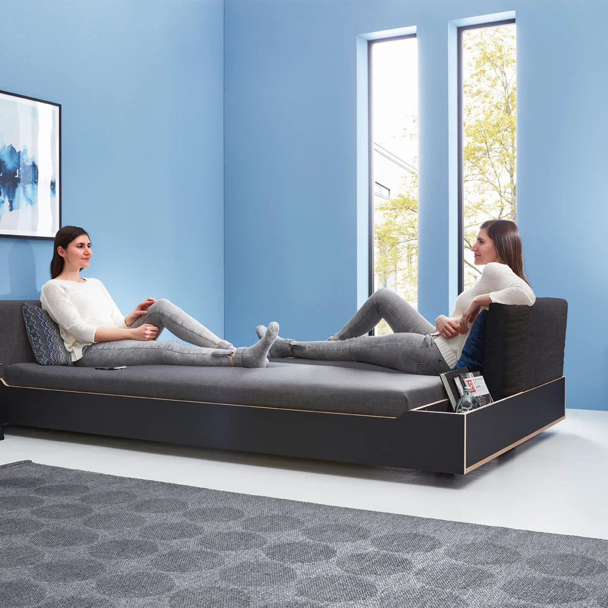 The Maude bed frame from Müller Small Living is a classic bed designed to meet modern requirements. It is designed by Swiss architect Michael Mettler, who has added practical features to the benefits of a cosy and stylish bed: The sleek and space-saving bed has compartments at the foot and head ends to store books and more. A special highlight is the headrest, which consists of two parts. Depending on your needs, it can also be hooked into the compartments at opposite ends to turn the bed into a sofa bed, a sofa bed or a sofa bed. Maude bed as a sofa bed, as a couch, or for working on a laptop.