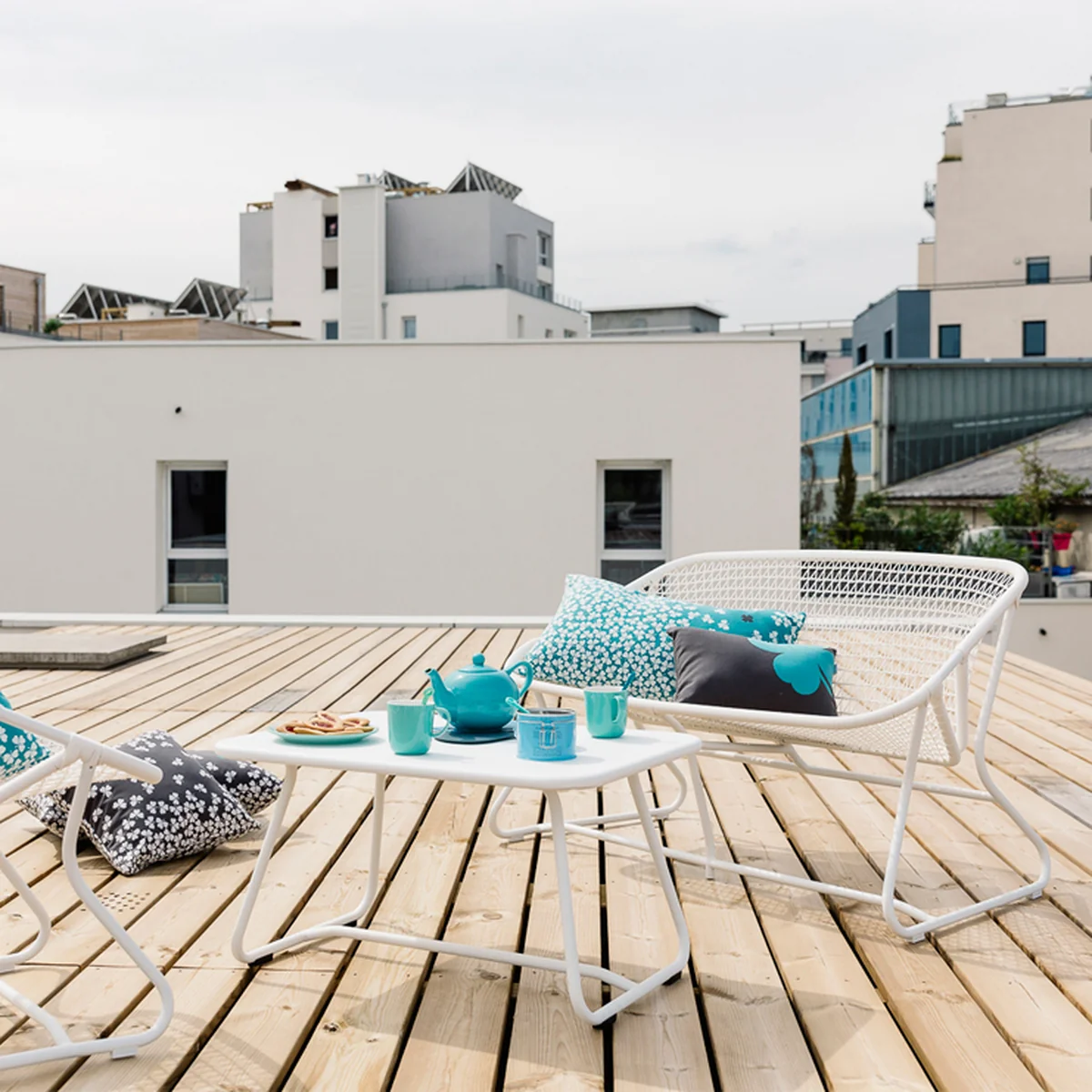 Young, comfortable and easily accessible - the Sixties Bench by Fermob is flexible in its design and is just as suited to outdoor use as inside the home. The retro design is by Frédéric Sofia. With its ample, rounded shape, the Sixties Bench creates a peaceful oasis in which to relax and escape day to day stress. It is a veritable invitation to sit with a partner and get comfy together.